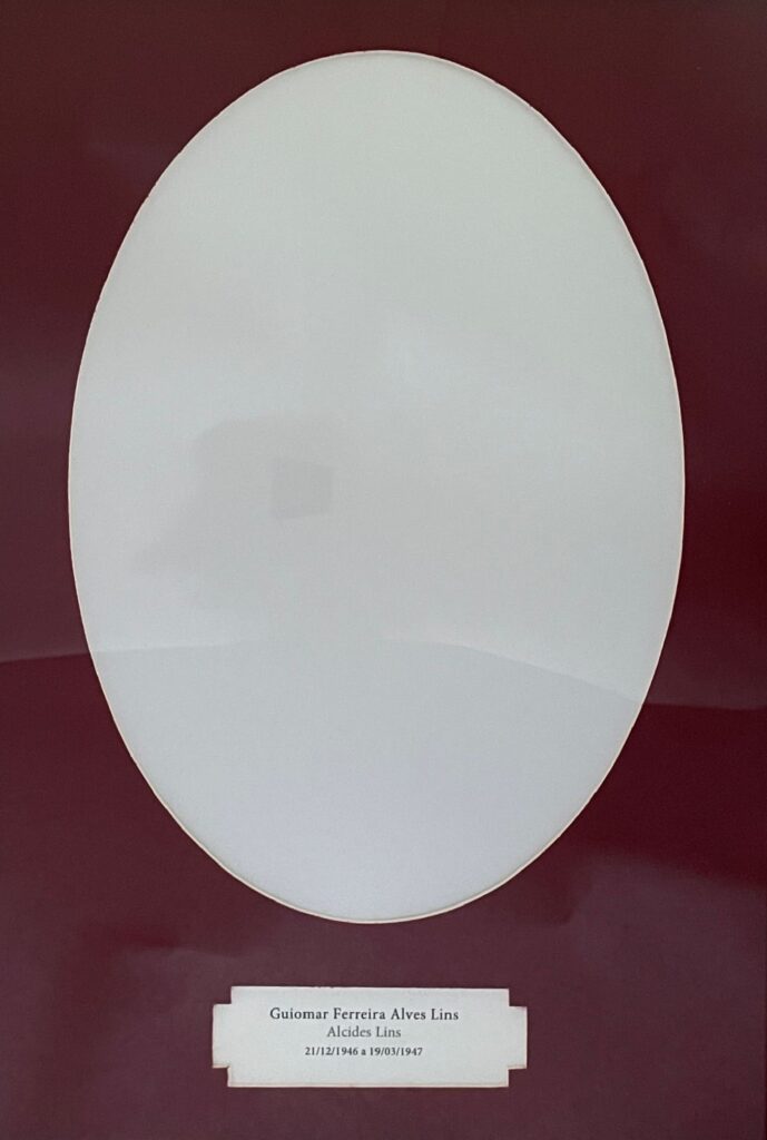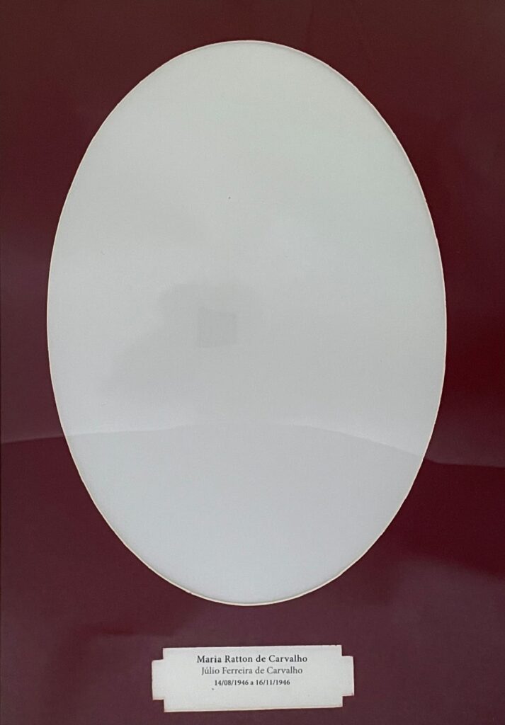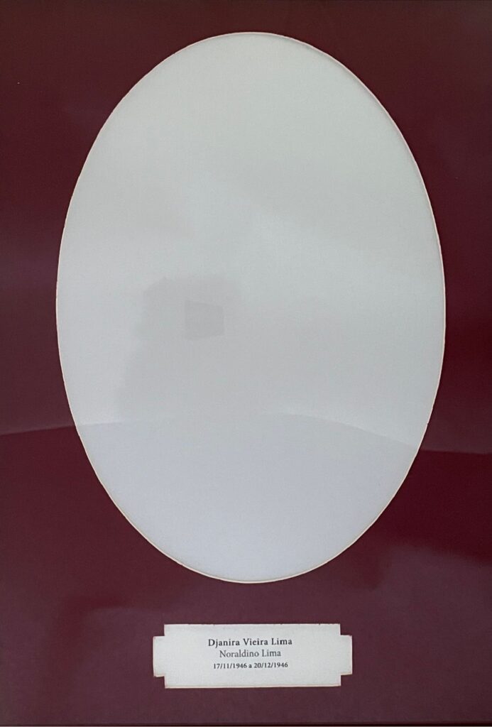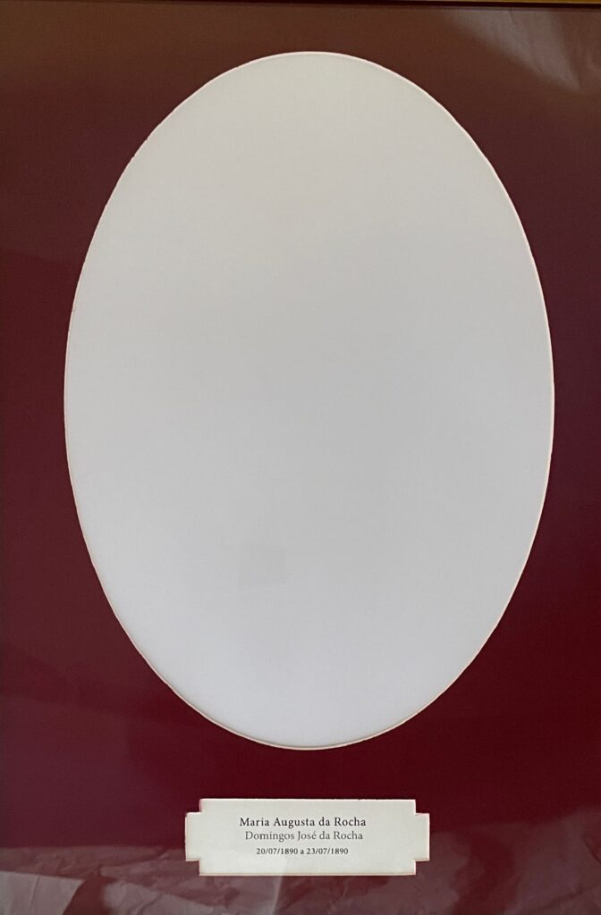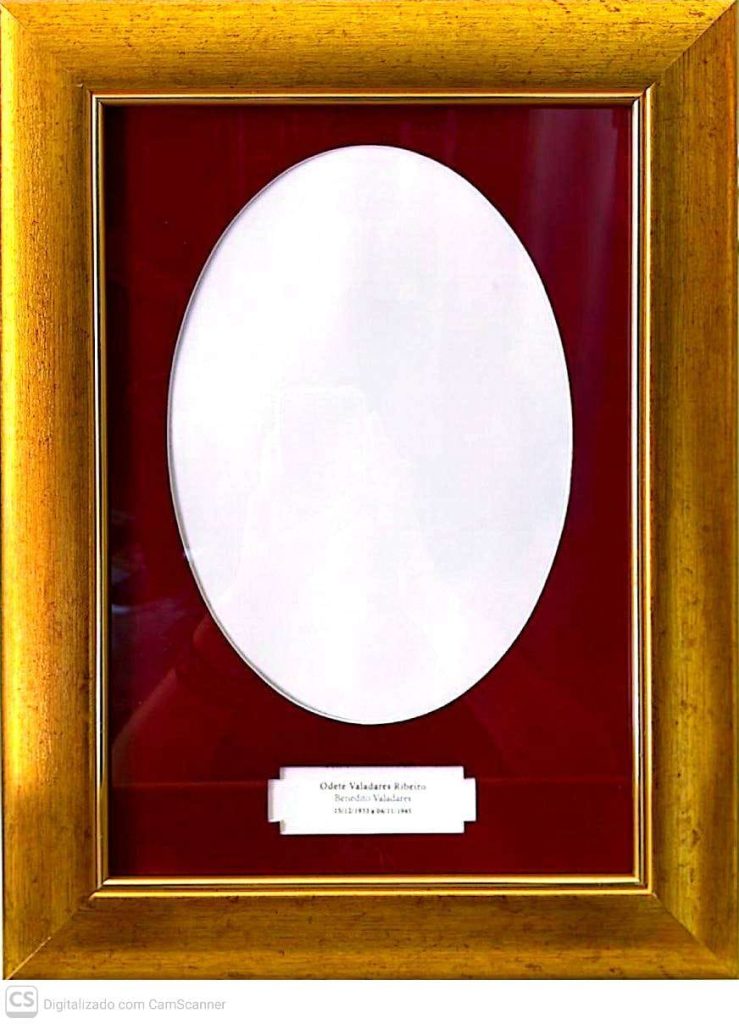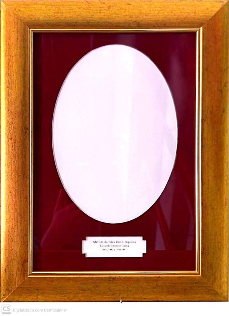 Retrato retangular, com moldura dourada e paspatur em formato oval, forrado em veludo vermelho. O espaço reservado à imagem, no interior da moldura, está em branco.
