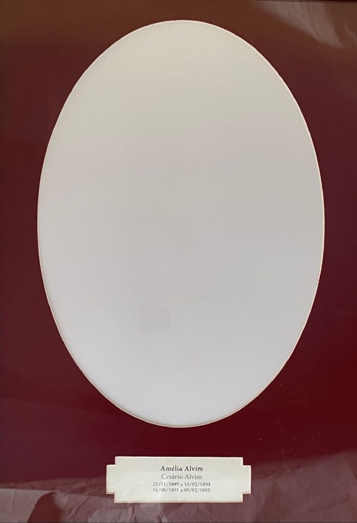 Retrato retangular, com moldura dourada e paspatur em formato oval, forrado em veludo vermelho. O espaço reservado à imagem, no interior da moldura, está em branco.