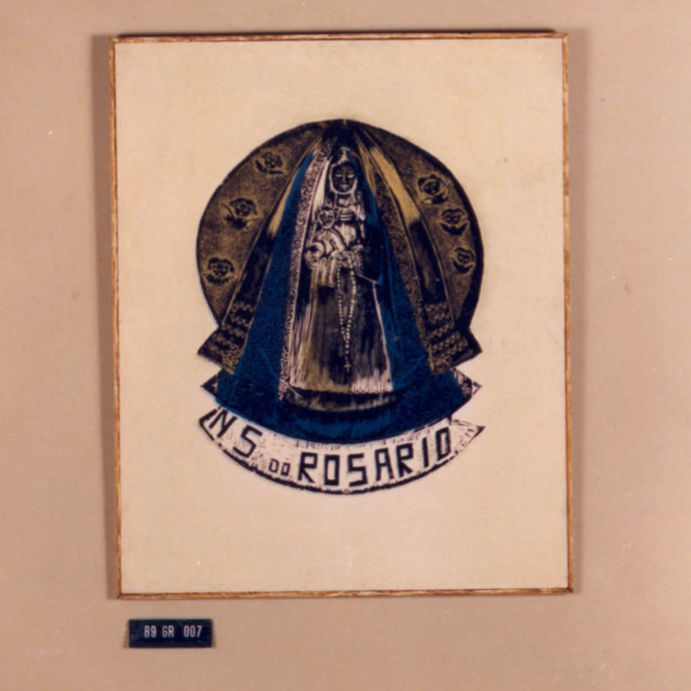 Representação de Nossa Senhora do Rosário, trazendo nas mãos o menino Jesus e o Rosário. É circundada por auréola dourada marcada por seis querubins. Embaixo aparece a inscrição N. Sra. do Rosário, em letras maiúsculas pretas.