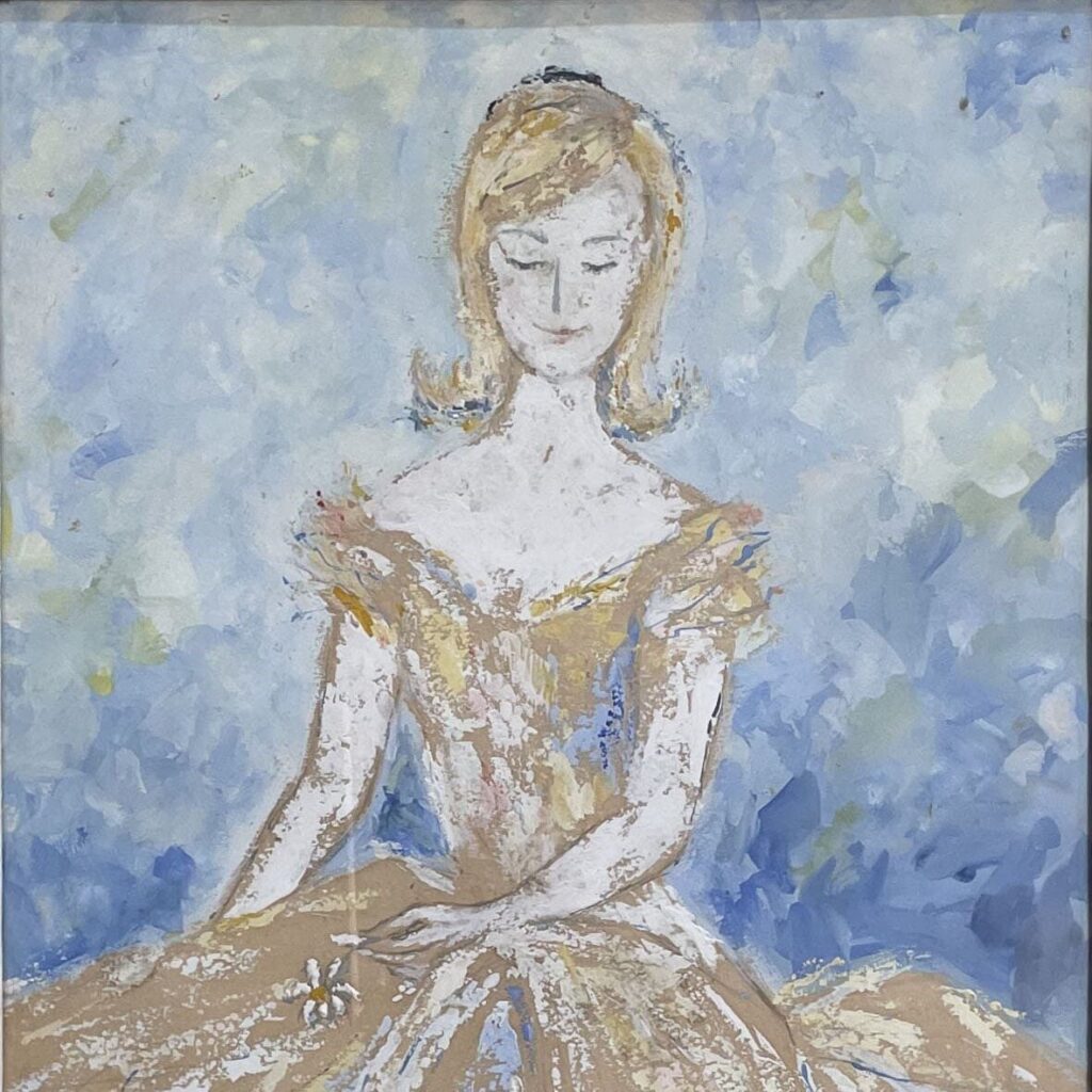 Figura feminina em posição frontal, cabelos longos, olhos fechados, braço esquerdo sobre o colo, mão segurando uma flor, braço direito estendido para trás. Traja um verstido longo aberto.