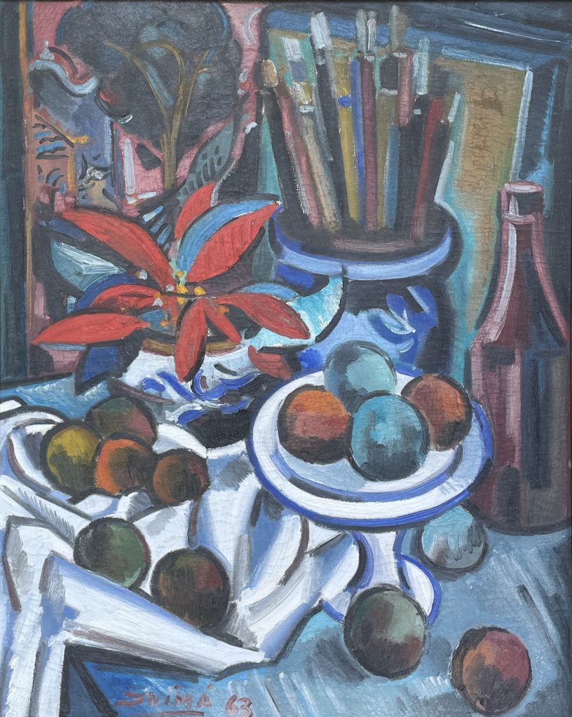 A pintura retrata objetos dispostos sobre uma mesa pincelada em tons de verde e azul. Sobre a mesa, em primeiro plano, está um prato circular apoiado sob um pedestal, que acomoda quatro esferas: duas vermelhas, uma azul e uma cinza. Fora do pedestal, posicionados em cima de um pano de mesa branco, estão diversas esferas […]