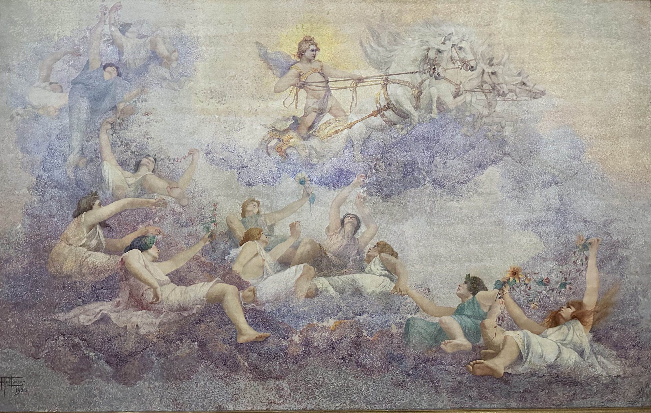 Na parte superior da composição destaca-se a figura masculina de Apollo, posicionada acima das mulheres e avançando pelo céu. O Deus apresenta cabelos loiros e corpo amplamente exposto. Ele veste um tecido lilás que cobre a região da virilha e envolve parcialmente o corpo, com parte do pano esvoaçando ao vento. Sobre o peito, usa uma cinta dourada que adorna sua figura. Apollo segura com ambas as mãos as rédeas de uma quadriga dourada, um carro de modelo romano antigo com duas rodas.