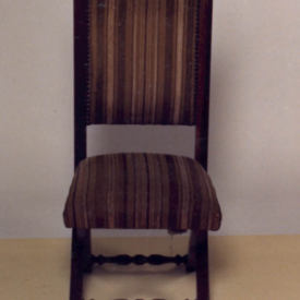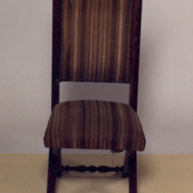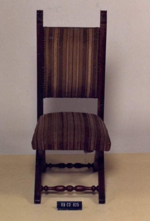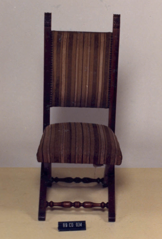 Cadeira em tesoura estruturada em madeira, estofada em tecido listrado, espaldar reto, arrematado por dois cantos. Assento quadrangular. Pernas em X. Travessas torneadas em nós e frisos.