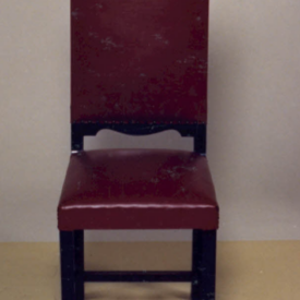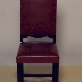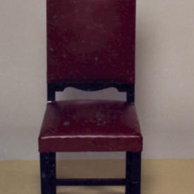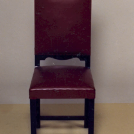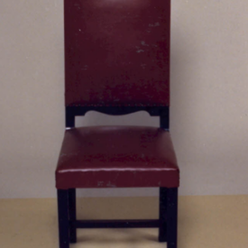 Cadeira estruturada em madeira, com estofarrento em couro, espaldar alto, retangular, com cachaço recortado em curva e contra-curva, e assento retangular. Pernas de secção quadranguIar, com amarração em H. Estofamento em pelica ocre com tacheados.