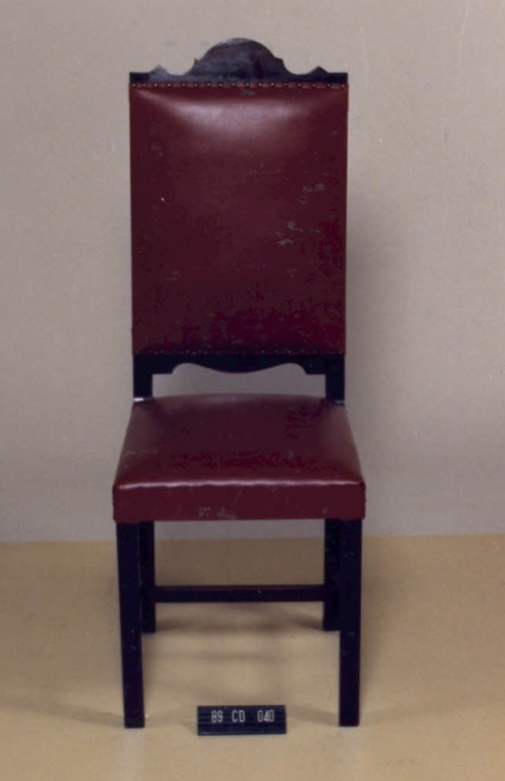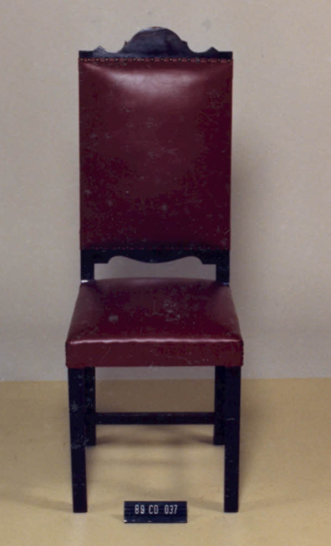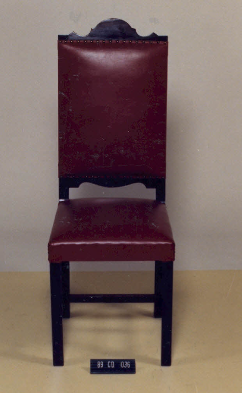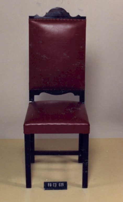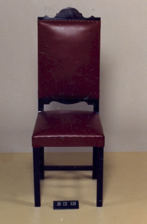 Peça em madeira recortada e envernizada em partes pregadas, estofamento em pelica ocre com tacheados.