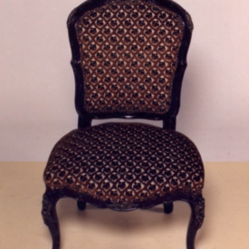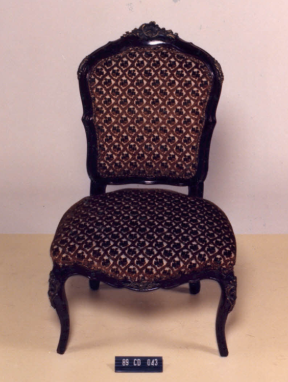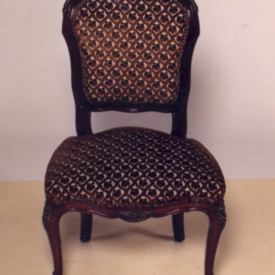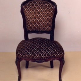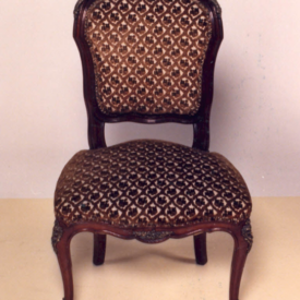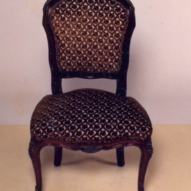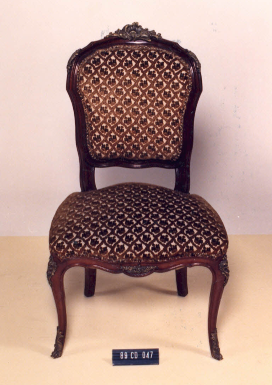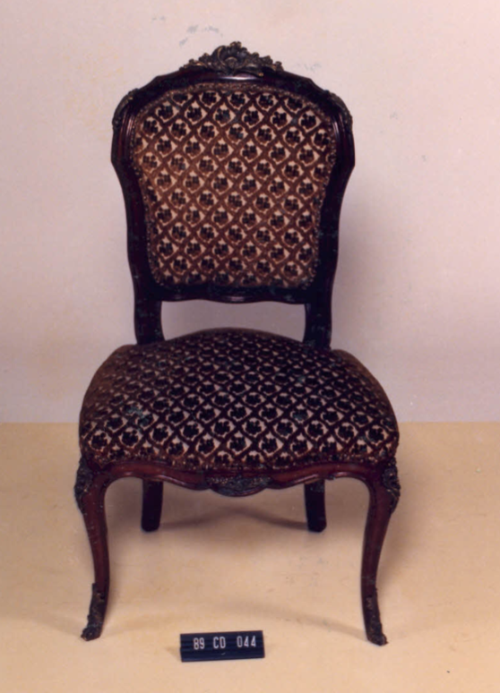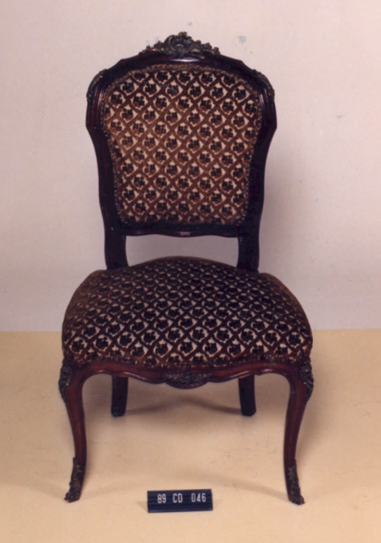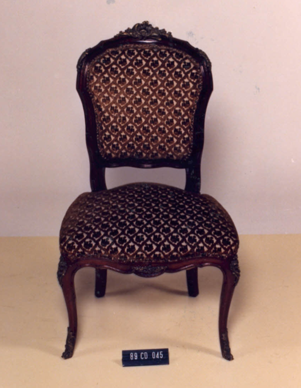 Cadeira com estrutura em madeira, estofamento guilhochês, espaldar em violão,contorno em frisos; arremate superior em rocalha, fIores e linguetas; nos cantos folhagens e frisos sinuosos. Assento em forma de escudo. Abas recortadas em curvas e contra-curvas. Frente ornada em C, acantos e flores. Pernas dianteiras curvas em joelheiras, ornadas em rocalhas, C, flores e folhagens. Pernas traseiras curvas.
