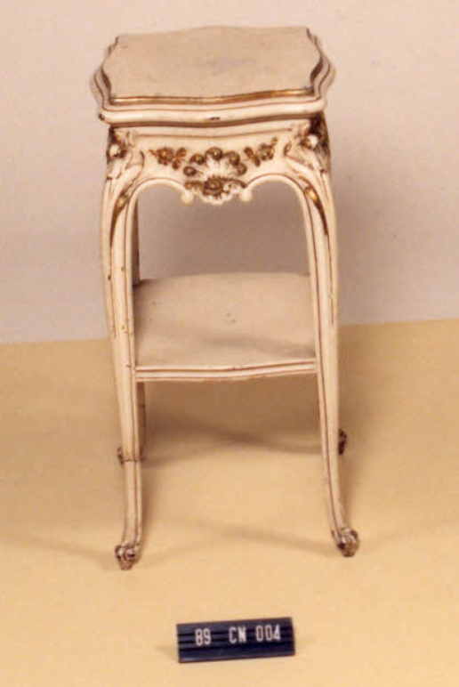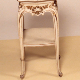 Cantoneira com tampo quadrangular, borda em curvas e contra-curvas. Aba reoortada em curvas, ornada por plumagem rococó, com flores, frisos em C e S e rocalhas. As quinas são marcadas por acantos que descem até as pernas. Pernas com joelheiras suaves frisadas, recurvadas inferiormente onde são arrematadas por duas volutas. Pés em sapata. Ao centro, prateleira lisa, de borda emoldurada.