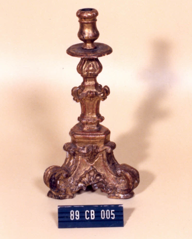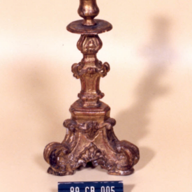 Castiçal com base trifacetada, tronco triangular, apoiado em sapatas; ornado em concheado, volutas e elemento fitomorfo. Coluna trifacetada, emoldurada e ornada por frisos em S, elementos fitomorfos e volutas ao centro; parte superior em curva. ArandeIa circular, em forma de prato, frisada. Bocal em forma de vaso, com frisos.