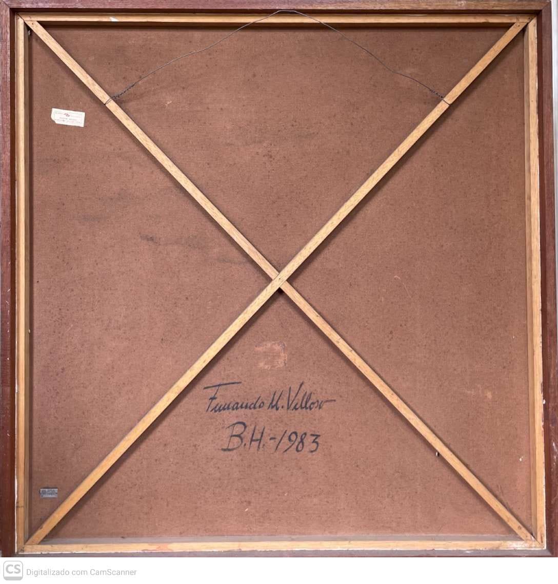 Pintura datada de 1983, assinada por FERNANDO VELLOSO. Formas abstratas, com retângulo e elemento de forma irregular.