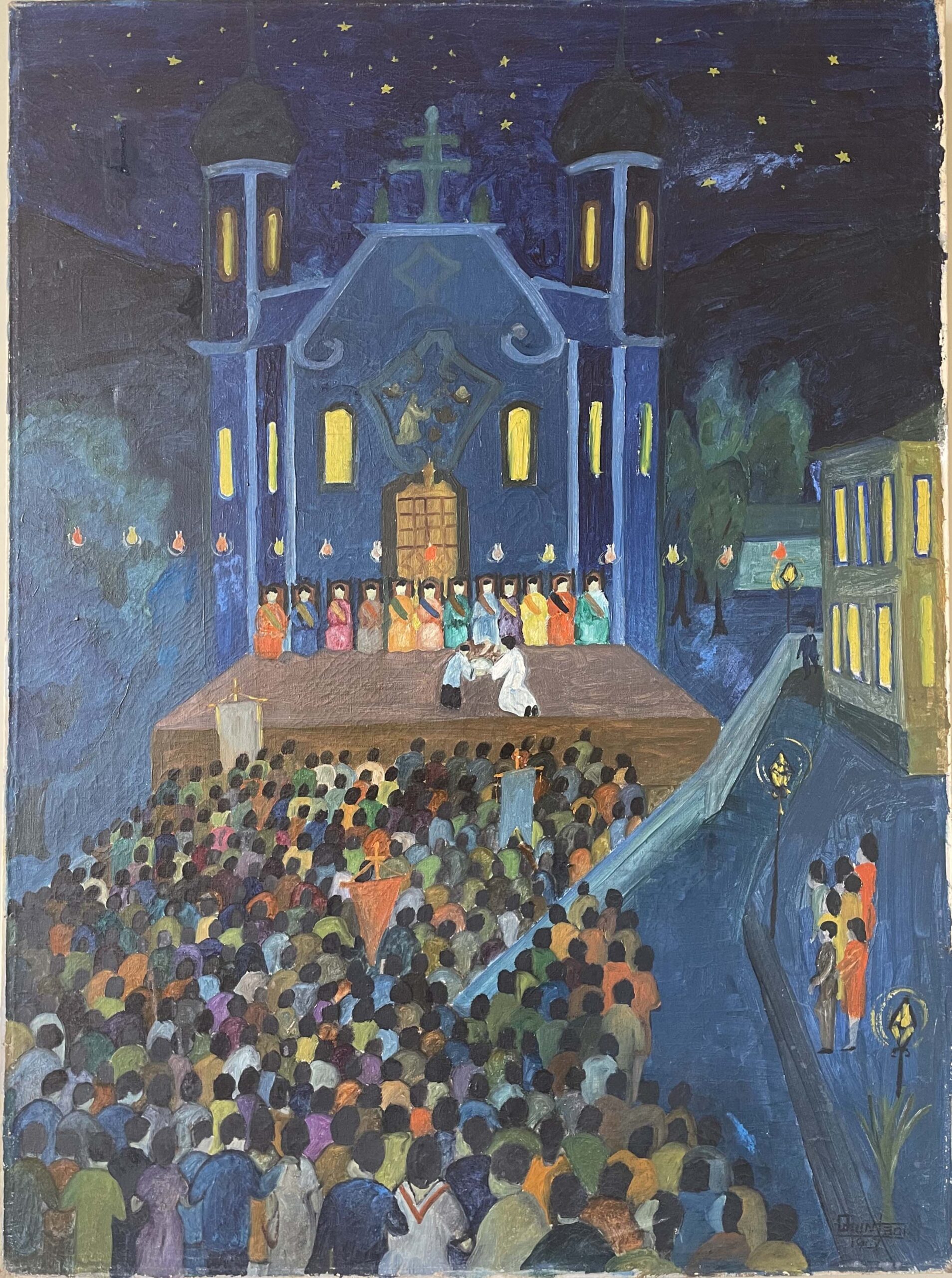 Pintura representando um lava-pés, no adro da Igreja de são Francisco, em Ouro Preto. Aparecem doze figuras de apóstolos, duas figuras segurando uma bacia. No primeiro pIano, aparece uma multidão. Fundo com a Igreja de são Francisco, casas laterais, árvores. Parte do céu com estrelas.