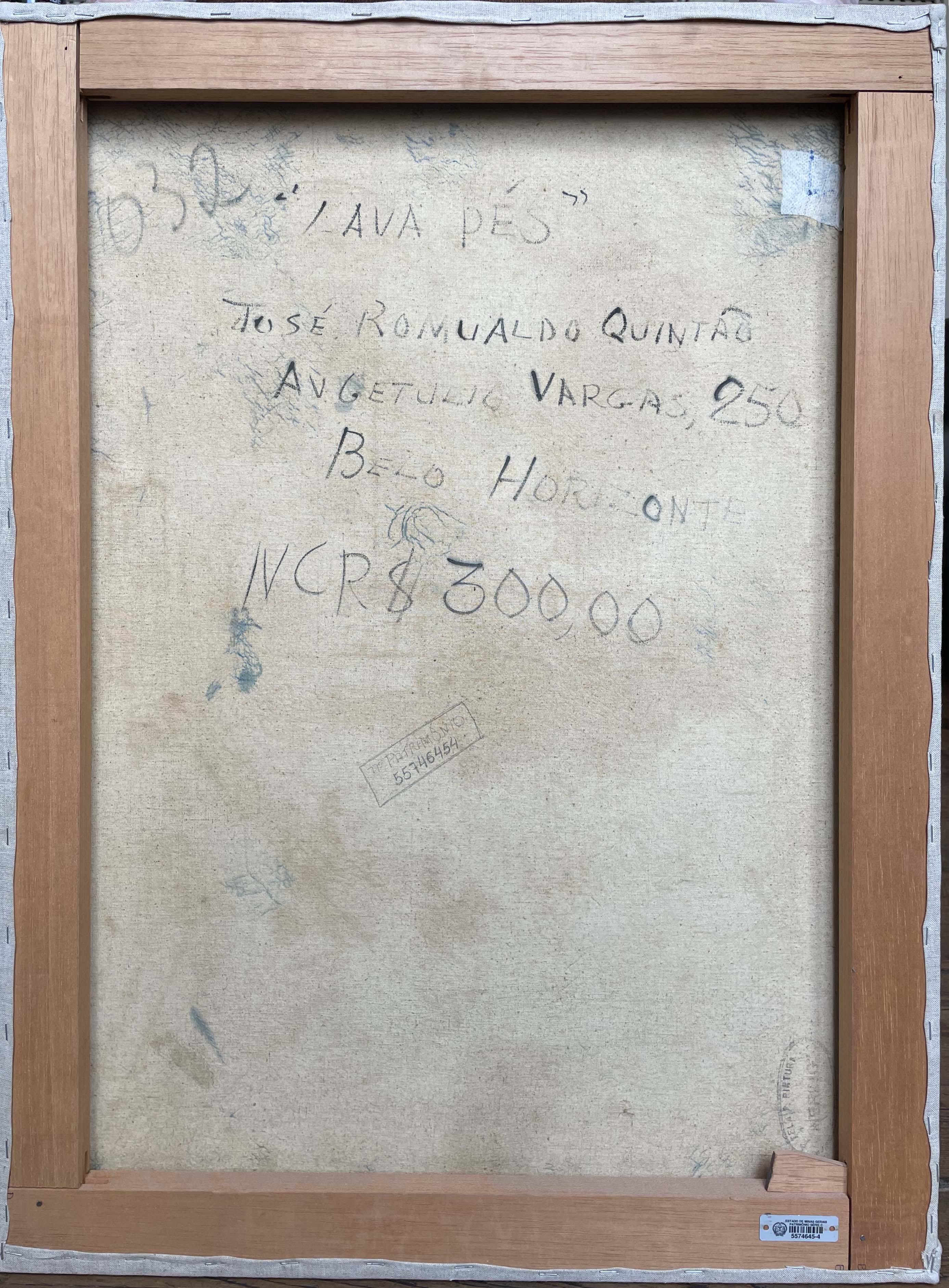 Pintura assinada por Quintão, datado de 1967, em formas figurativas. Cena de Lava-pés.