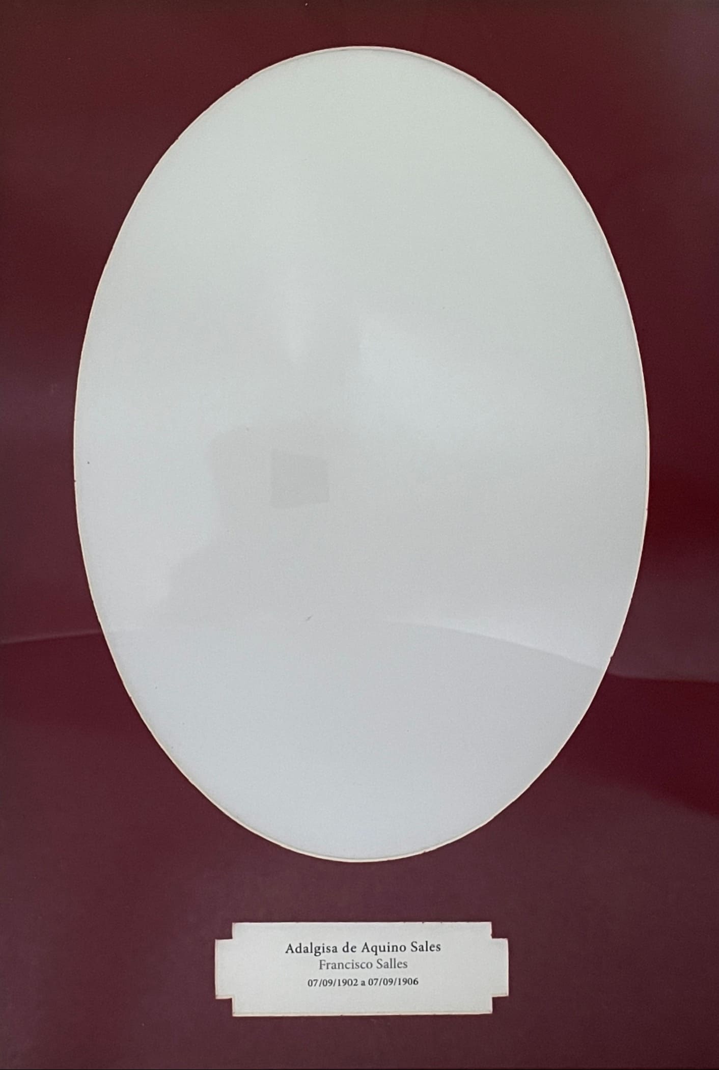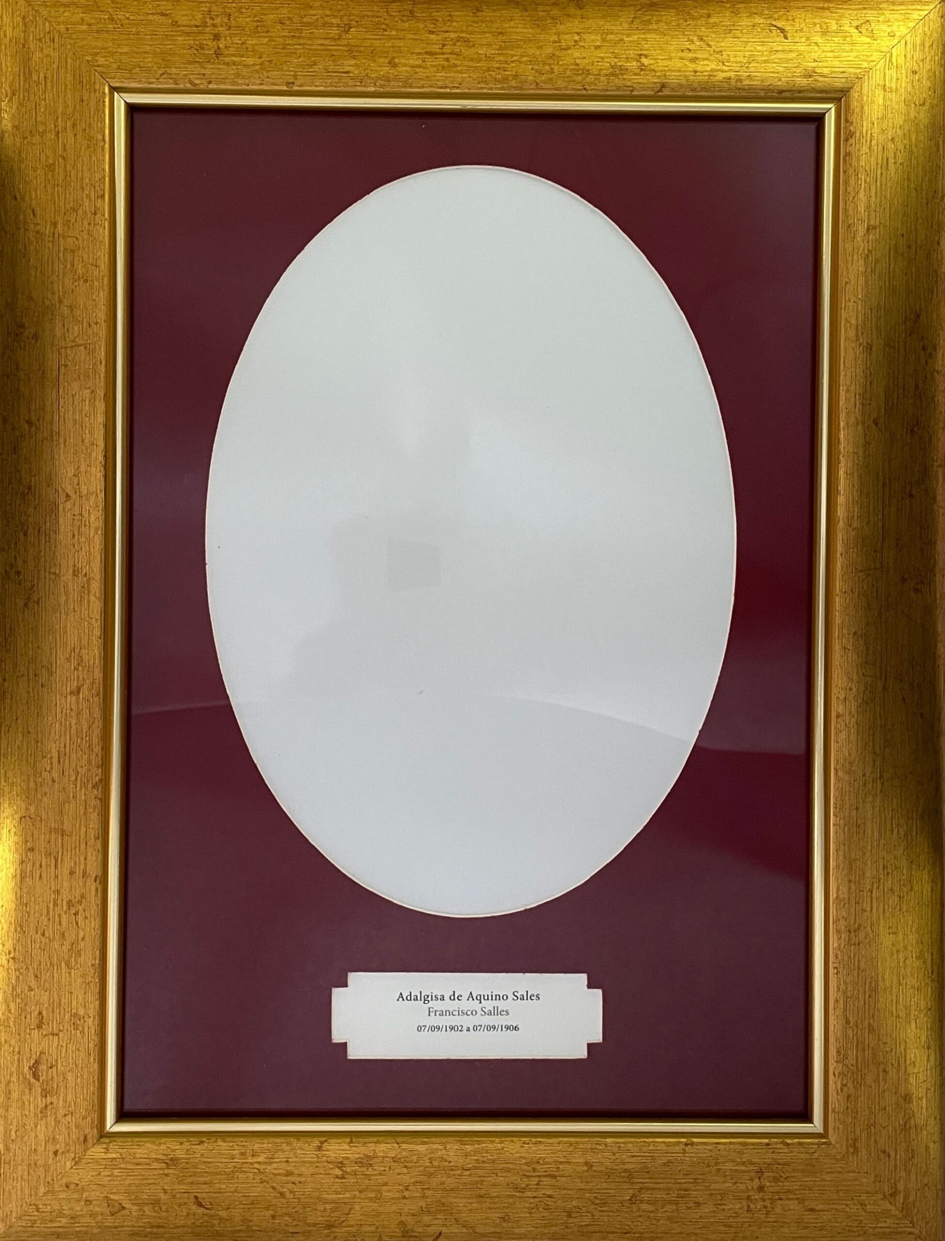 Retrato retangular, com moldura dourada e paspatur em formato oval, forrado em veludo vermelho. O espaço reservado à imagem, no interior da moldura, está em branco.