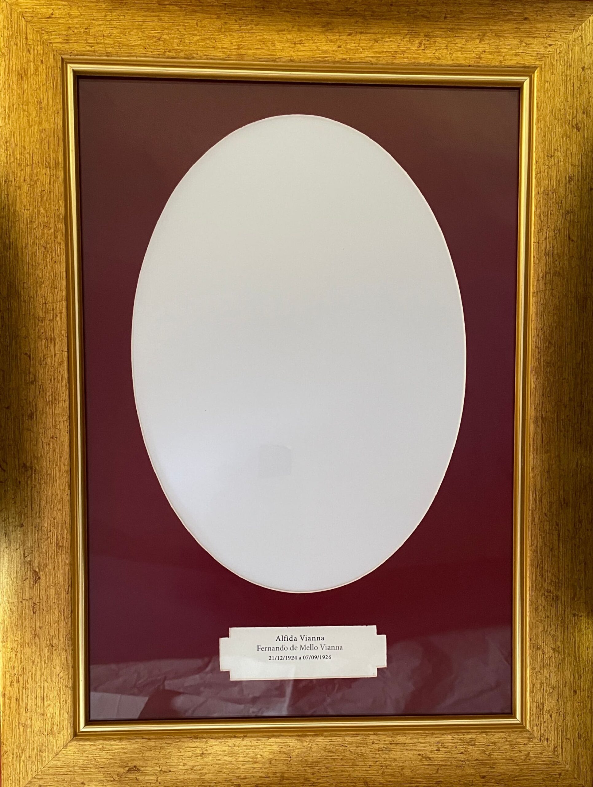 Retrato retangular, com moldura dourada e paspatur em formato oval, forrado em veludo vermelho. O espaço reservado à imagem, no interior da moldura, está em branco.