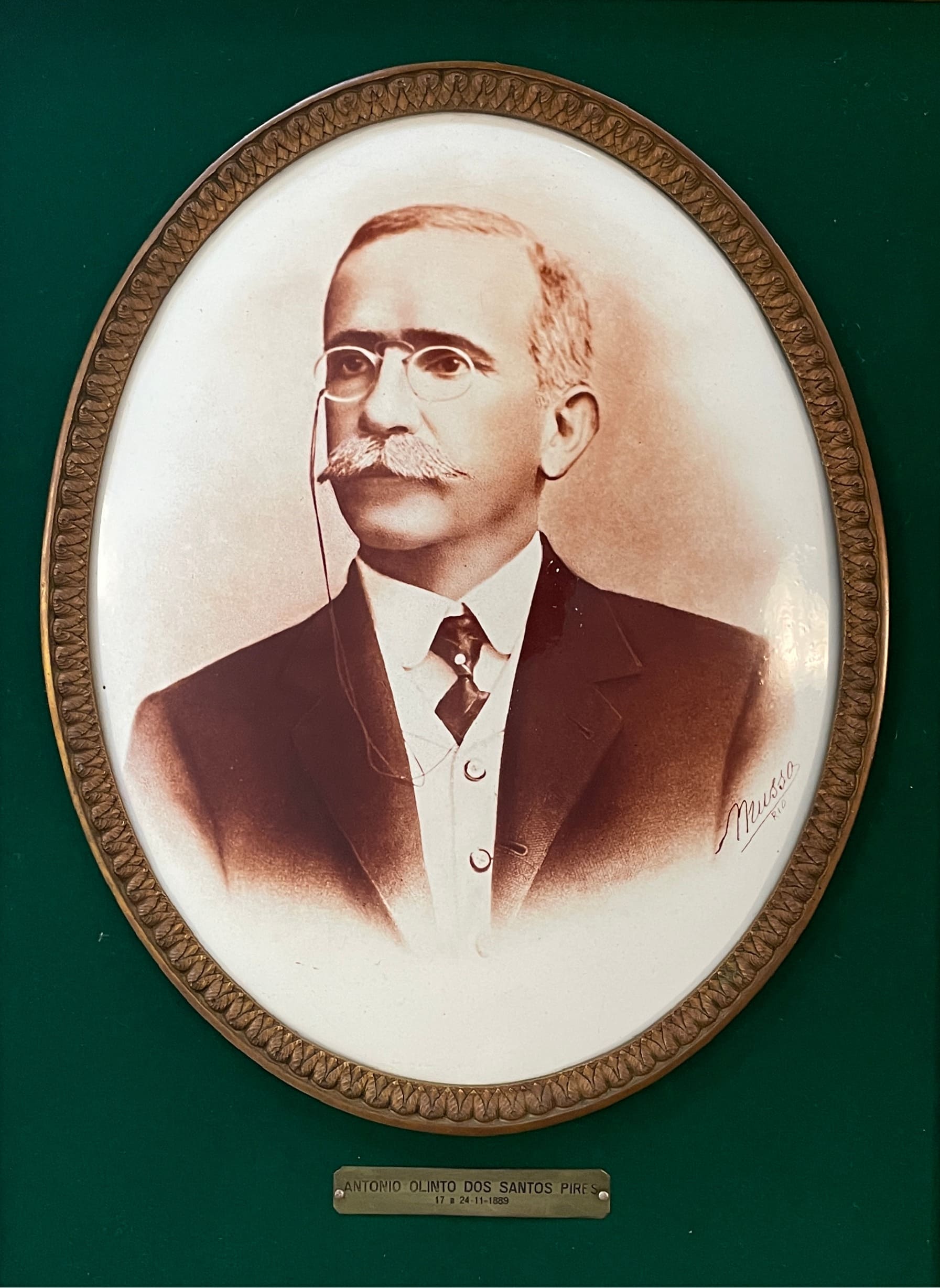 Retrato do Presidente de Estado Antônio Olinto dos Santos Pires em terno e gravata. Porta óculos de atos ovais com cordão à esquerda. Contorno em friso fitomorfo oval. Moldura retangular dourada, com quinas fitomorfas ressaltadas.