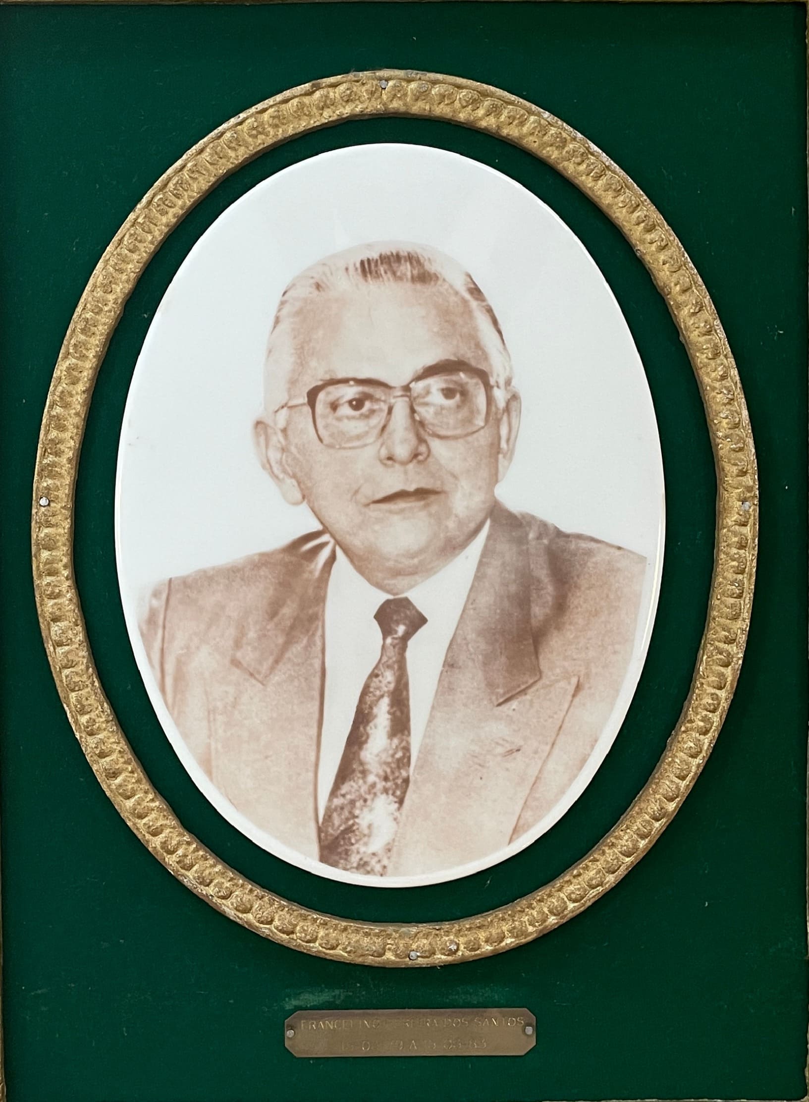 Retrato do Governador Francelino Pereira, em terno e óculos de armação escura. Contorno em friso fitomorfo oval, moldura retangular dourada, com quinas ressaltadas.