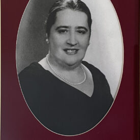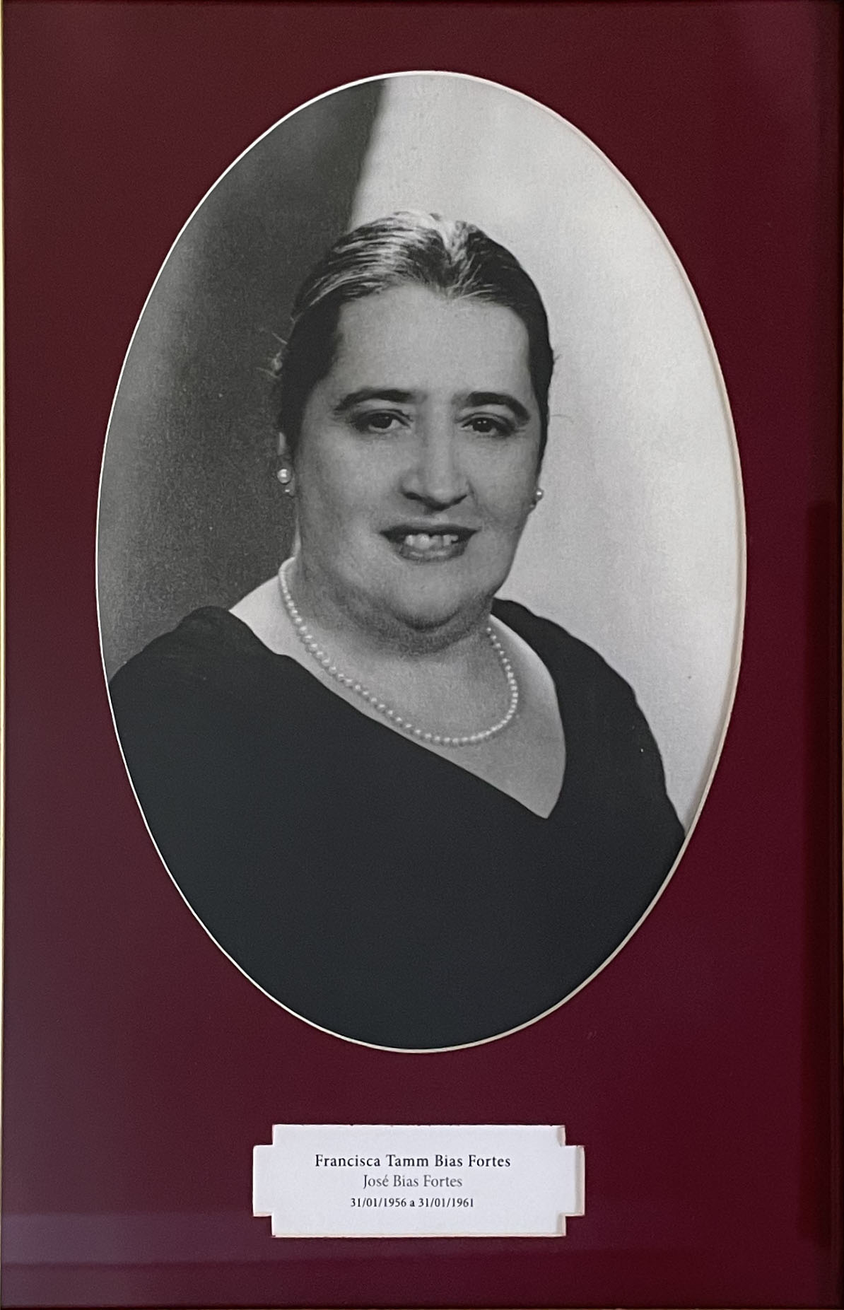 Retrato retangular com moldura dourada e paspatur em formato oval, forrado em veludo vermelho. O espaço reservado à imagem, no interior da moldura, mostra Francisca Tamm Bias Fortes, que utiliza um vestido preto, brincos e colar de pérolas. A figura está sorrindo, possui cabelos escuros que estão presos em um penteado atrás de sua cabeça e seu olhar está direcionado para a frente. A imagem está em preto e branco.