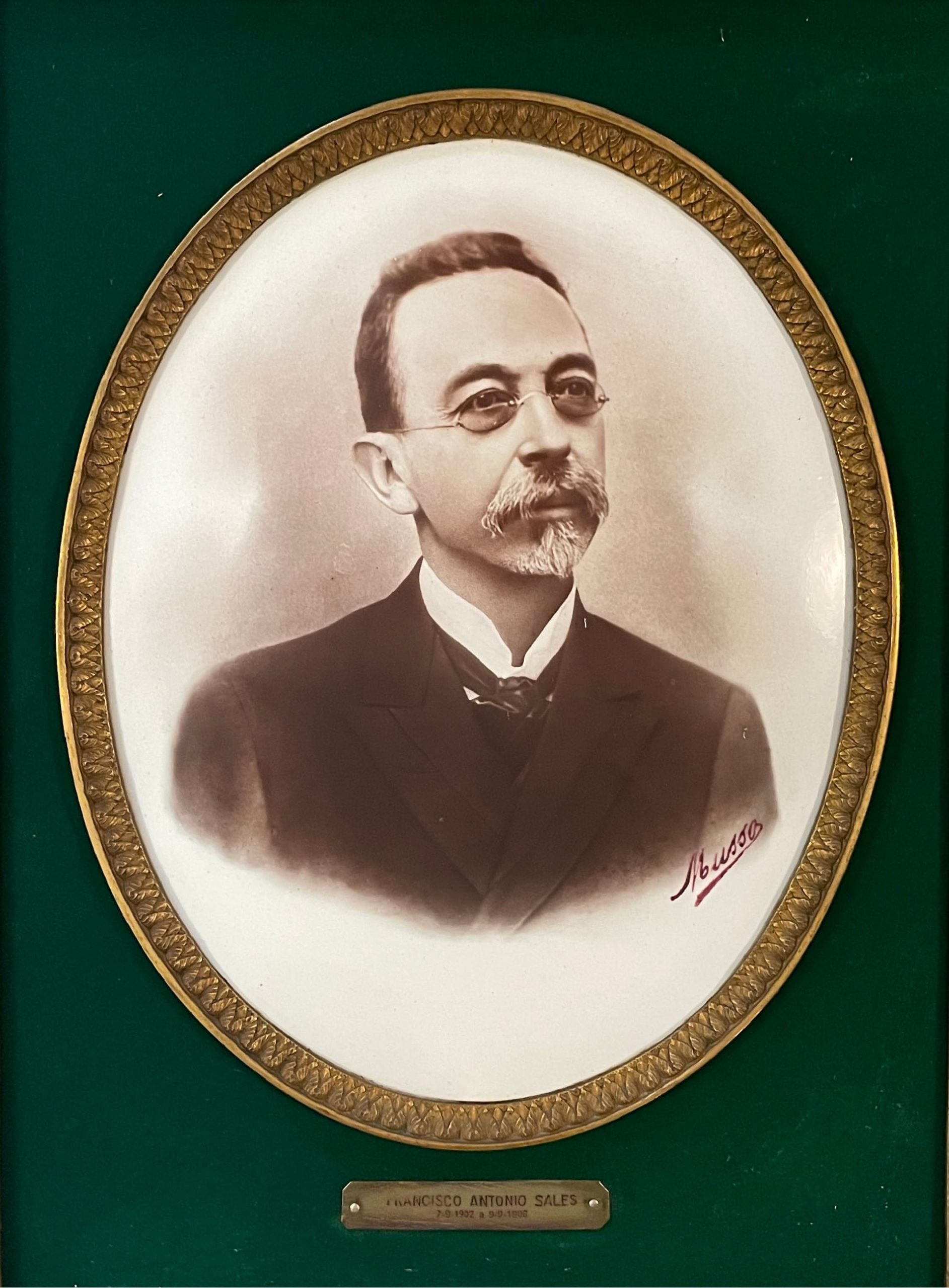 Retrato do Presidente do Estado Francisco Antonio Salles, em terno e gravata. Contorno em friso fitomorfo oval. Moldura retangular dourada com quinas fitomorfas ressaltadas.