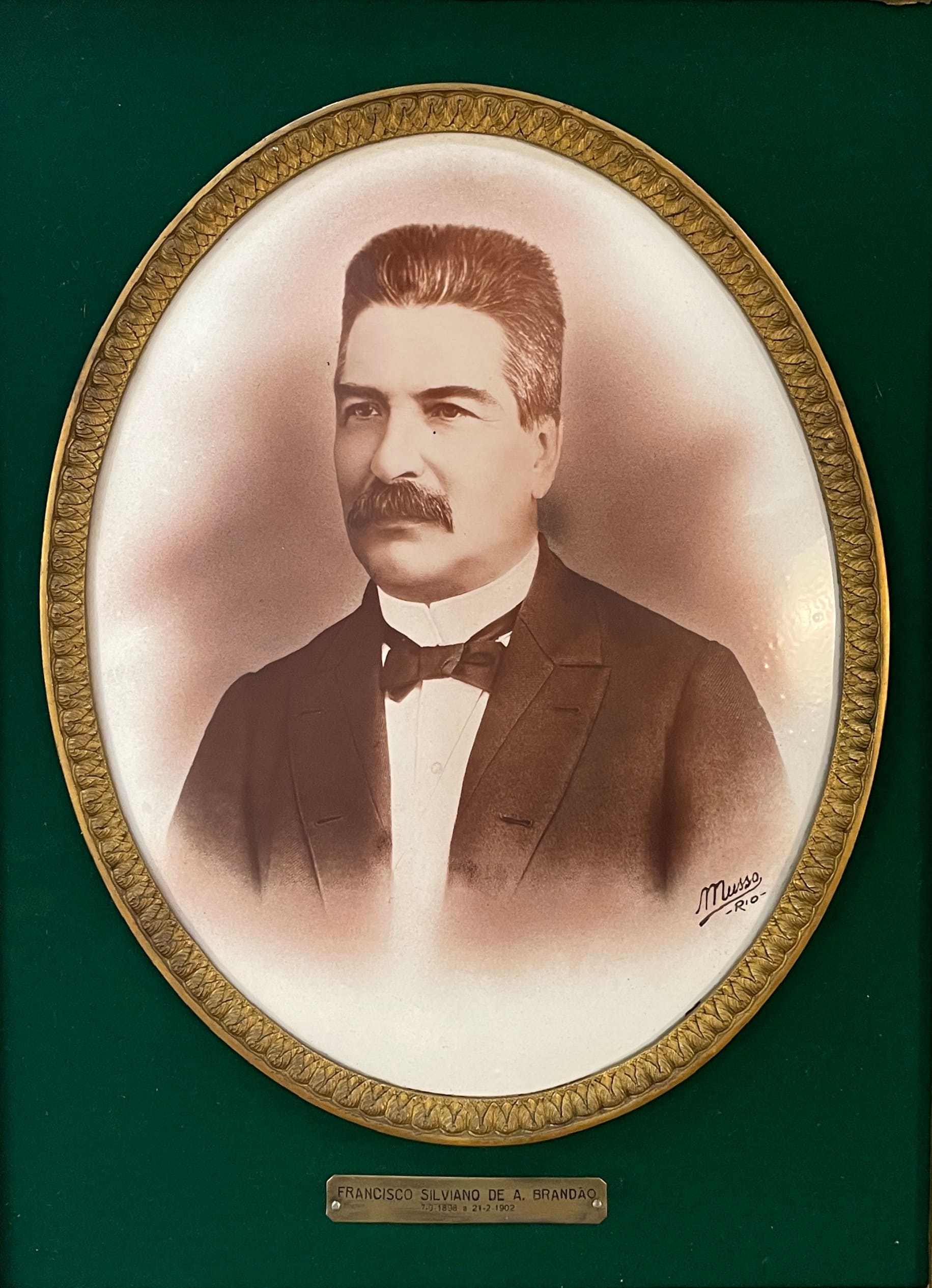Retrato do Presidente de Estado Francisco Silviano Brandão, em terno e gravata borboleta. Contorno em friso fitomorfo oval. Moldura retangular dourada com quinas fitomorfas ressaltadas.