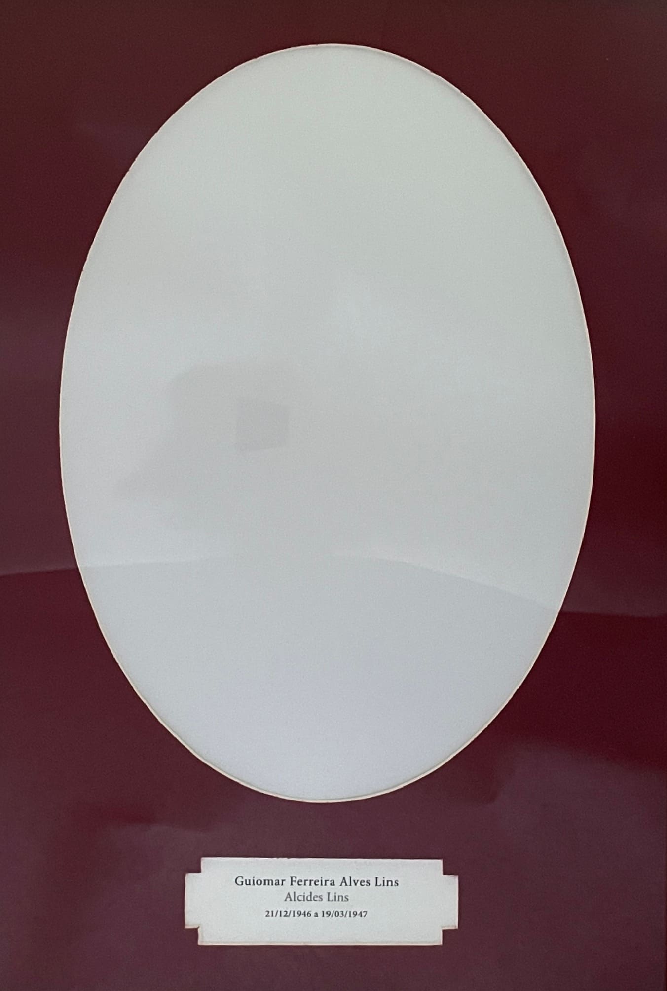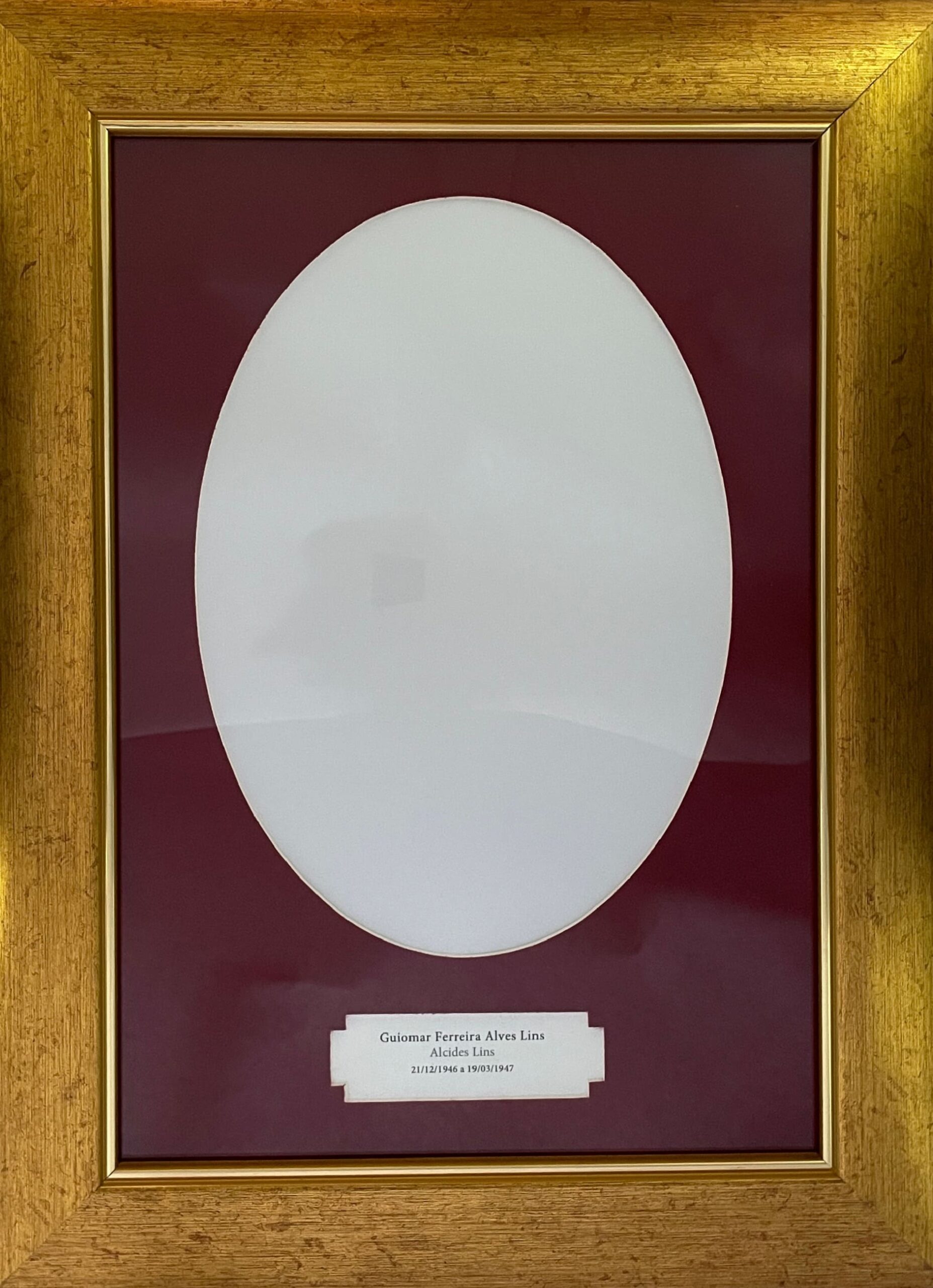 Retrato retangular com moldura dourada e paspatur em formato oval, forrado em veludo vermelho. O espaço reservado à imagem, no interior da moldura, está em branco.