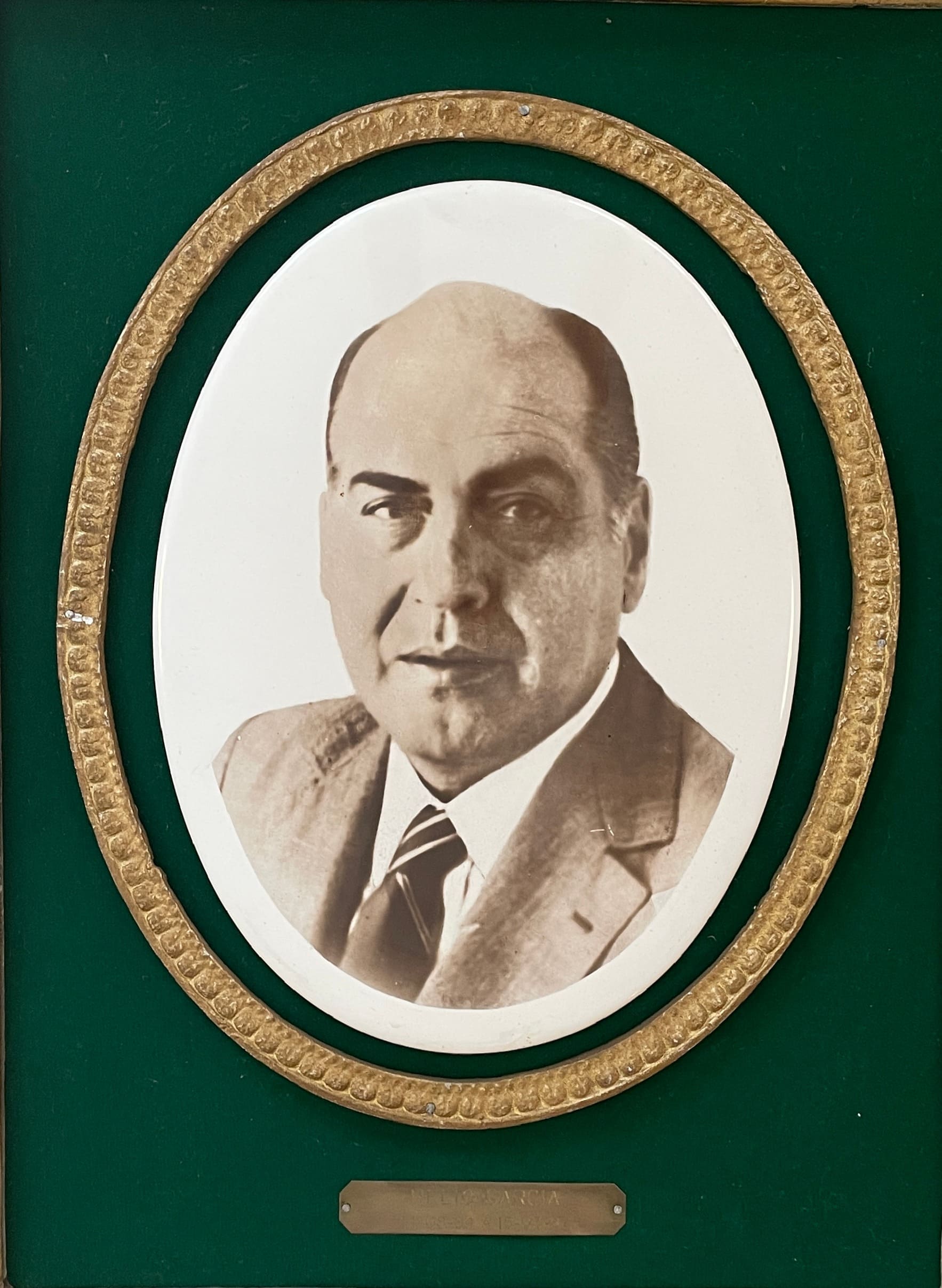 Retrato do Governador Hélio Garcia, em terno e gravata. Contorno em friso fitomorfo oval. Moldura retangular dourada com quinas fitomorfas ressaltadas.