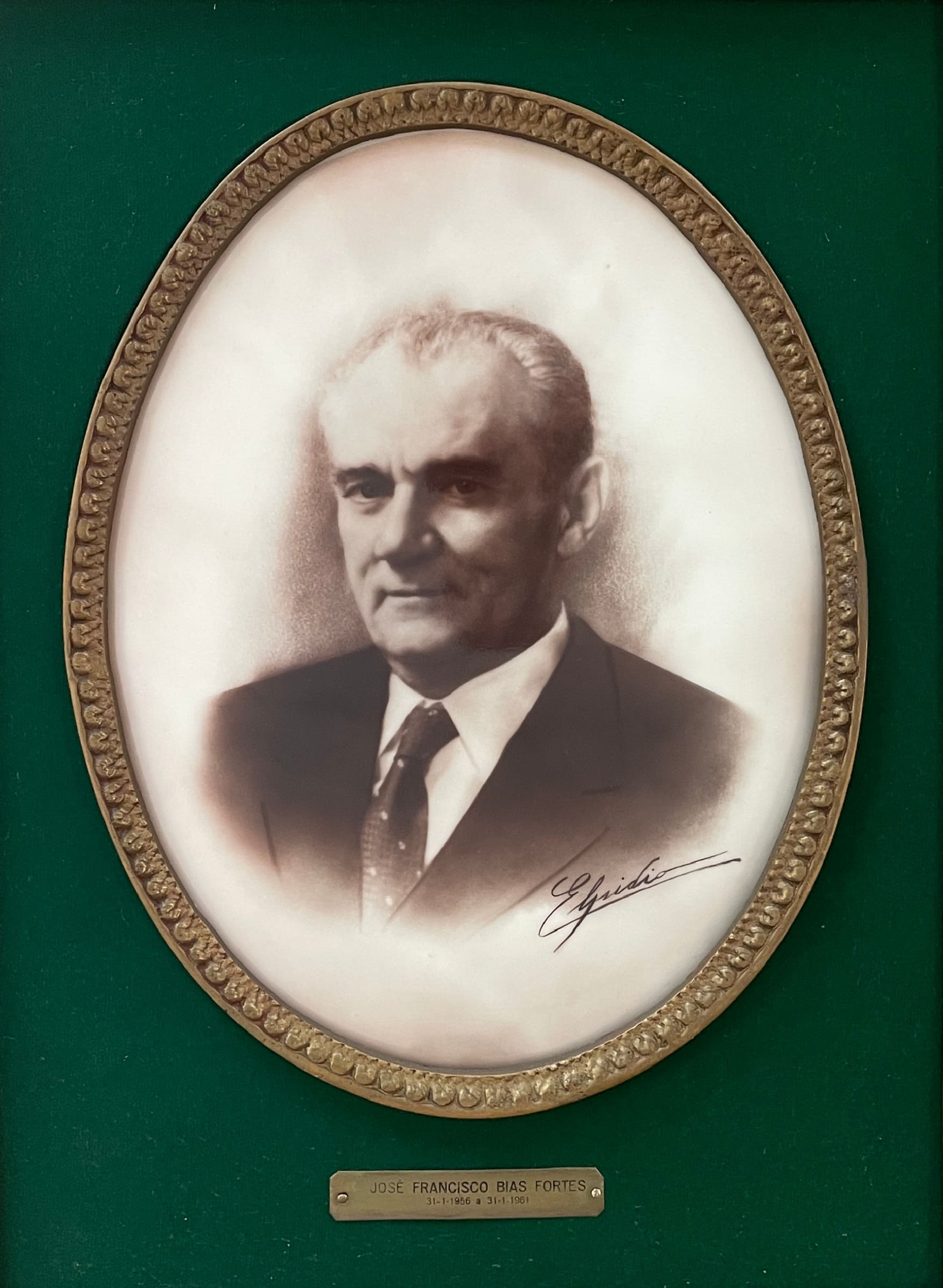 Retrato do Governador José Francisco Bias Fortes, em terno e gravata. Contorno em friso fitomorfo oval. Moldura retangular dourada com quinas fitomorfas ressaltadas.