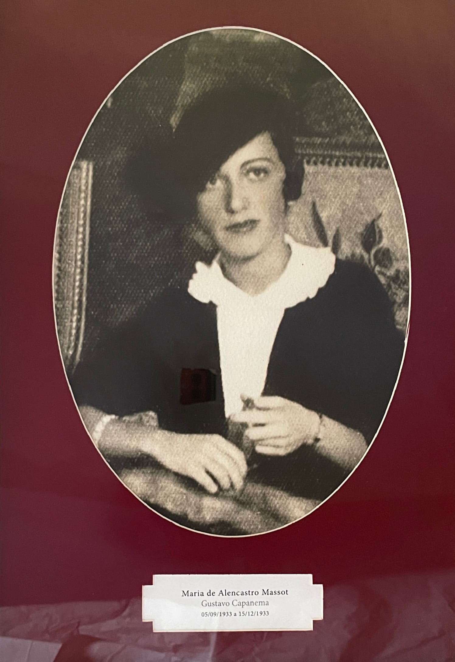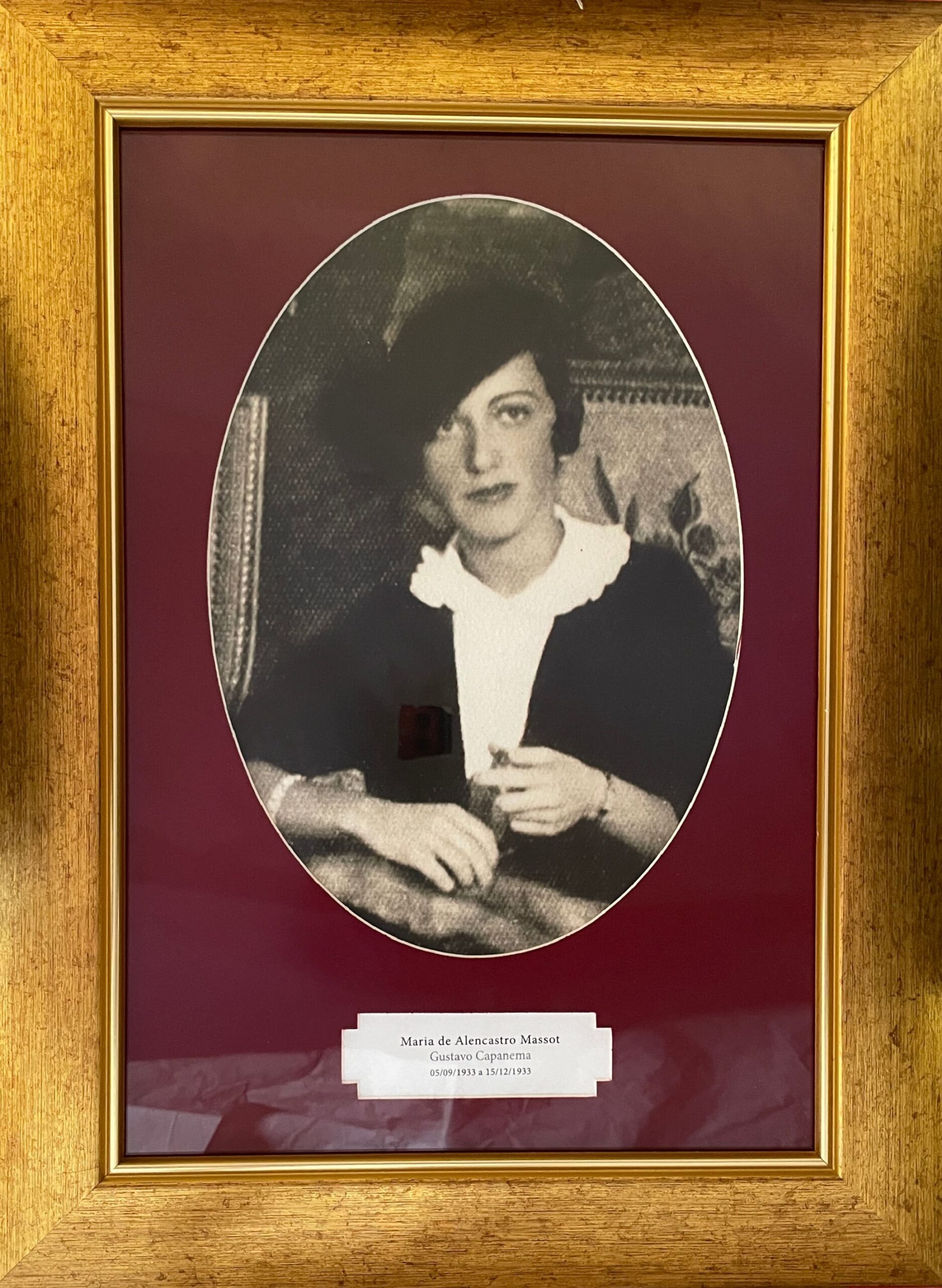 Retrato retangular com moldura dourada e paspatur em formato oval, forrado em veludo vermelho. O espaço reservado à imagem, no interior da moldura, mostra Maria de Alencastro Massot, vestindo um blazer preto sobre blusa branca. Seus cabelos escuros estão presos em um penteado e parcialmente cobertos por um chapéu preto. Ela usa pulseiras delicadas em ambos os braços e dirige o olhar para a direita. A imagem está em preto e branco.