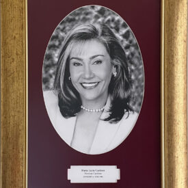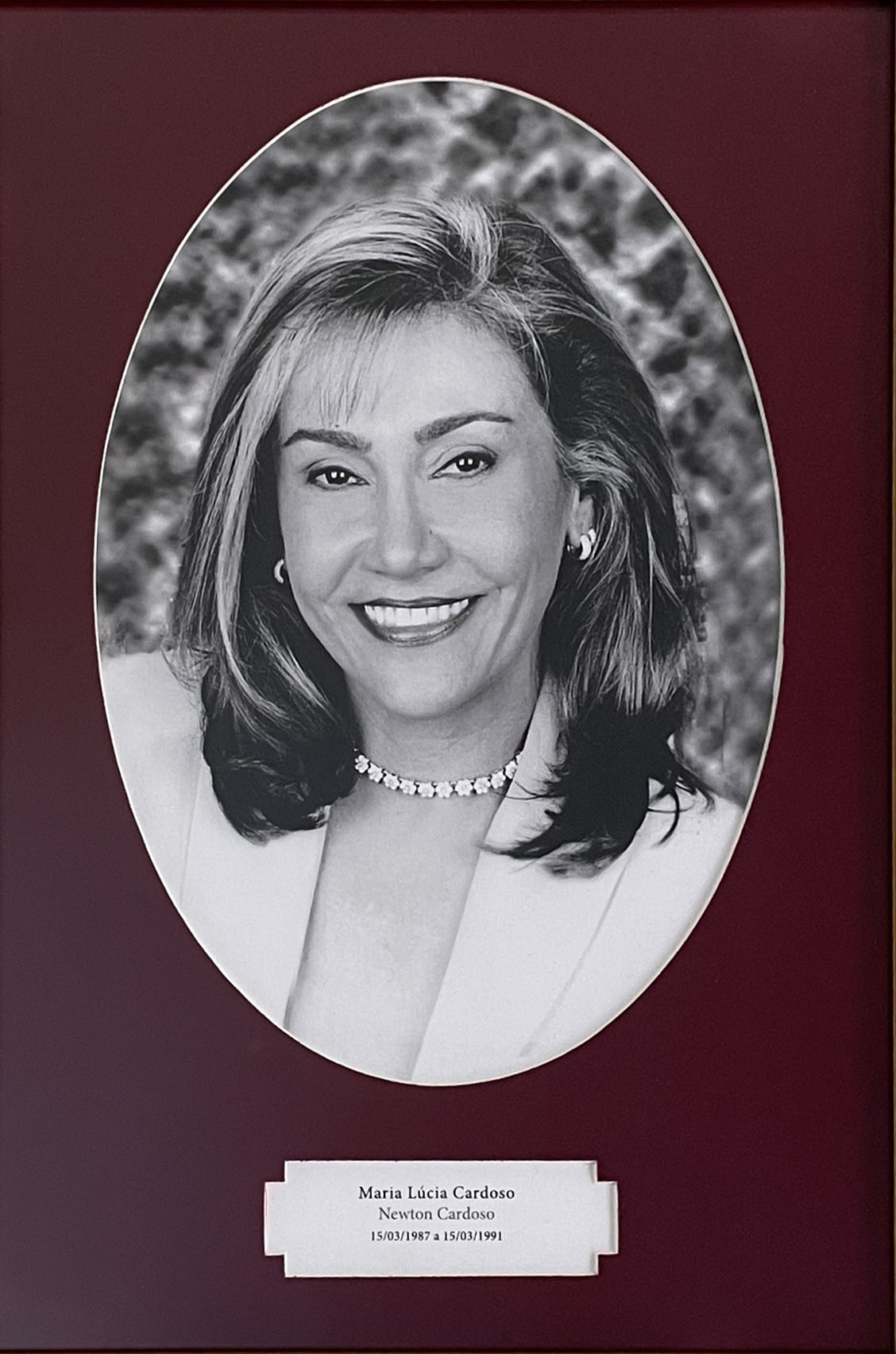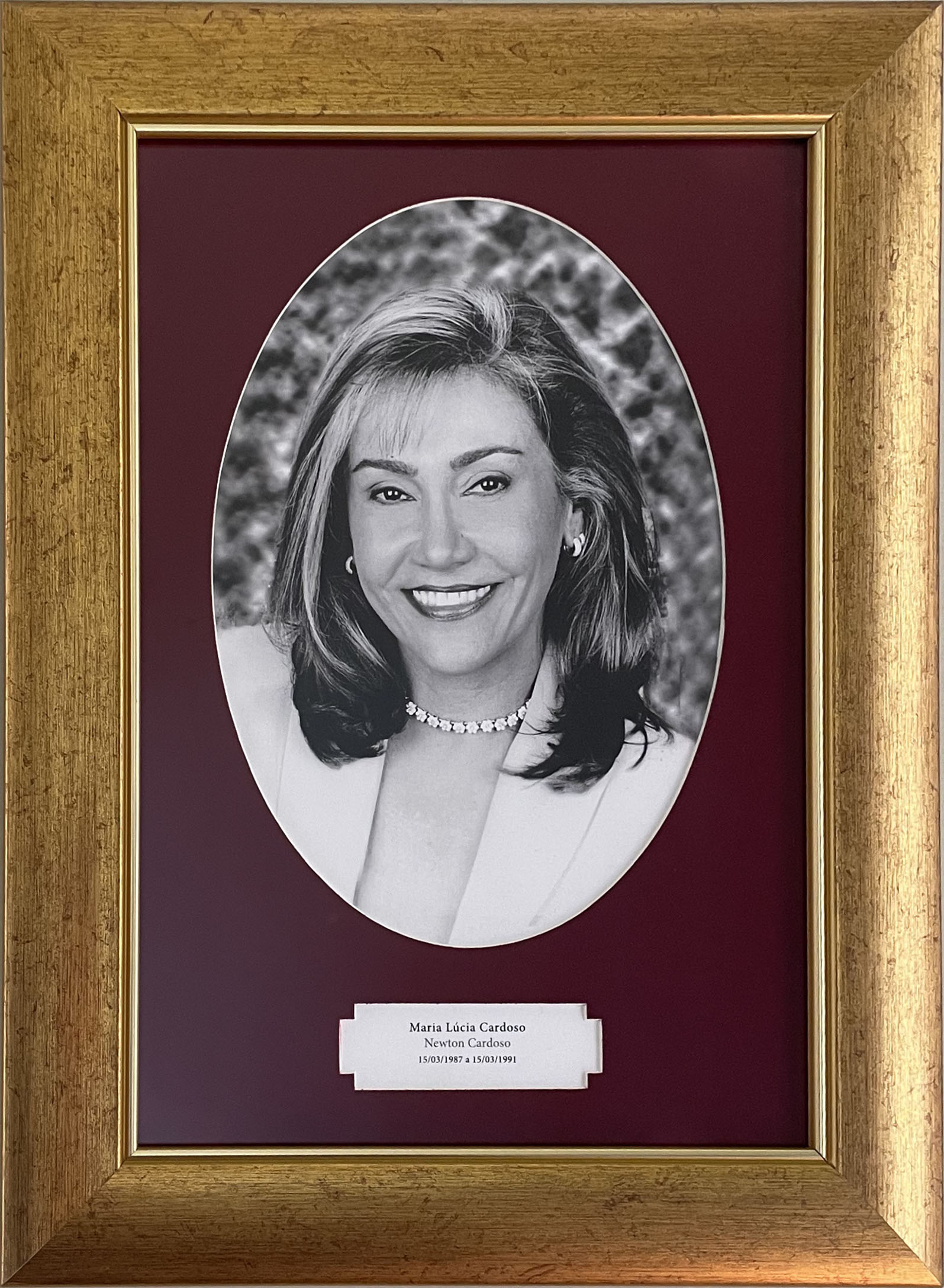 Retrato retangular, com moldura dourada e paspatur em formato oval, forrado em veludo vermelho. O espaço reservado à imagem, no interior da moldura, mostra Maria Cardoso, sorrindo, com cabelos medianos e pequenos brincos de argola. Está usando gargantilha e roupa branca.