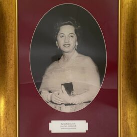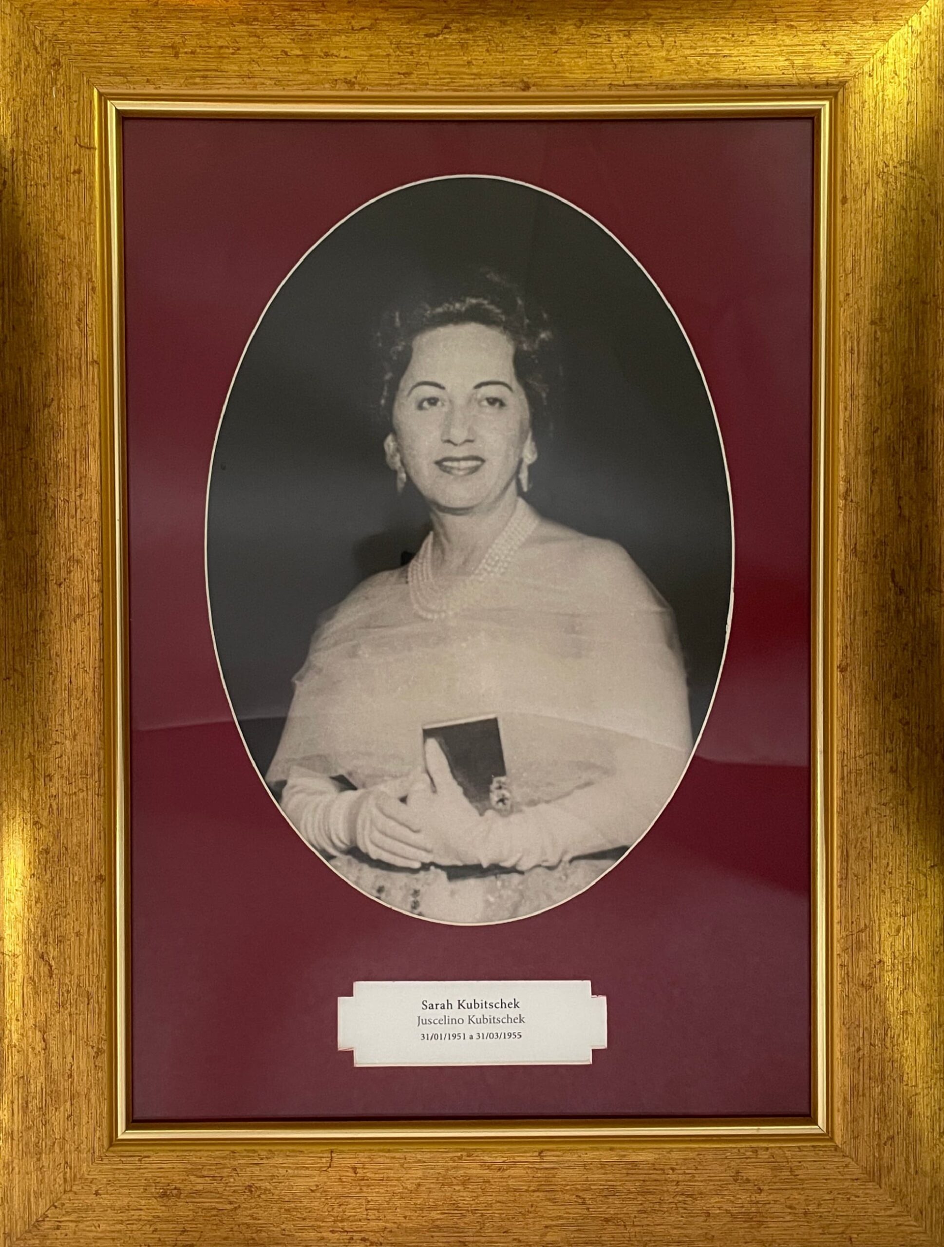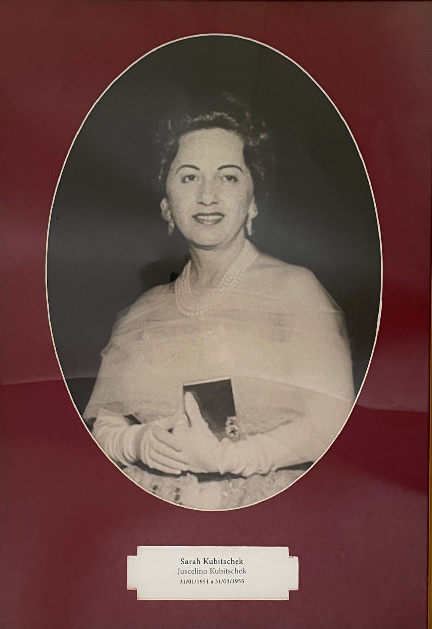 Retrato retangular com moldura dourada e paspatur em formato oval, forrado em veludo vermelho. O espaço reservado à imagem, no interior da moldura, mostra Sara Kubitschek, que utiliza um vestido branco de ombros à mostra, assim como brincos, colar de pérolas e luvas brancas, segurando uma pequena bolsa preta. A figura está sorrindo, possui cabelos escuros e seu olhar está levemente direcionado para a direita. A imagem está em preto e branco.