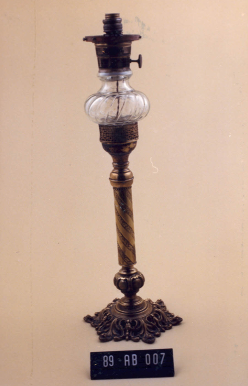 Base circular recortada e vazada, folhagens e flores. Coluna cilíndrica, frisos de ramos de flores retorcidos; arremate inferior em nó ovulado e superior em nó frisado. Parte superior de forma cônica, vazada em forma de filigrama ; ao centro bojo de vidro cônico com gomos retorcidos. Arrematado por elemento cônico, similar a um lampião, vazado […]