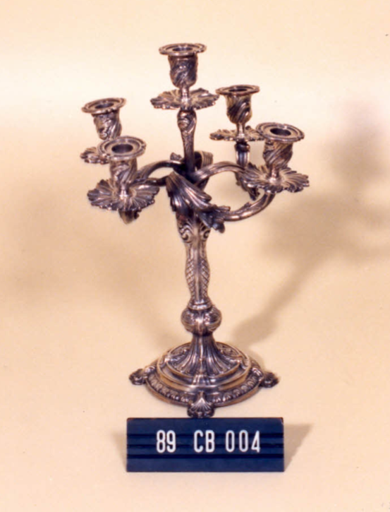 Candelabro com base circular, borda em friso de óvulos; parte central em folhagens e gomos, arremate em nó. Pés trilobados. Coluna cilíndrica com parte superior abaulada, revestida por quadriculados e elementos curvos. Quatro braços em ramagens retorcidas, e um braço central reto, ornados com motivos fitomorfos; arandela em forma de sépala, bocal cilíndrico revestido de […]