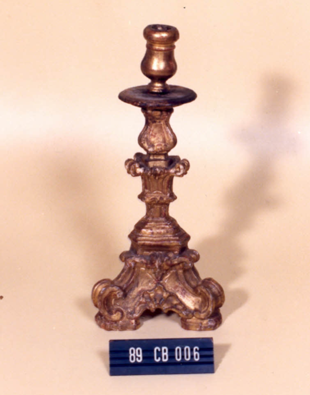 Castiçal com base trifacetada, tronco triangular, apoiado em sapatas; ornado em concheado, volutas e elemento fitomorfo. Coluna trifacetada, emoldurada e ornada por frisos em S, elementos fitomorfos e volutas ao centro; parte superior em curva. ArandeIa circular, em forma de prato, frisada. Bocal em forma de vaso, com frisos.