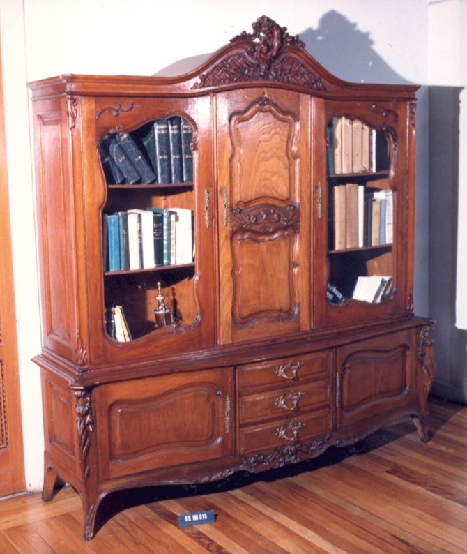 Móvel retangular, porta central espelhada; laterais curvas com portas envidraçadas e gavetas. Arremate superior em forma de frontão, com cesto de flores, espiga e reta cruzados, festôes e laços; cimalha em frisos, emoldurada em frisos de contas que se prolongam nas laterais. Porta central retangular com vidro em moldura oval, contornada por friso de contas; […]