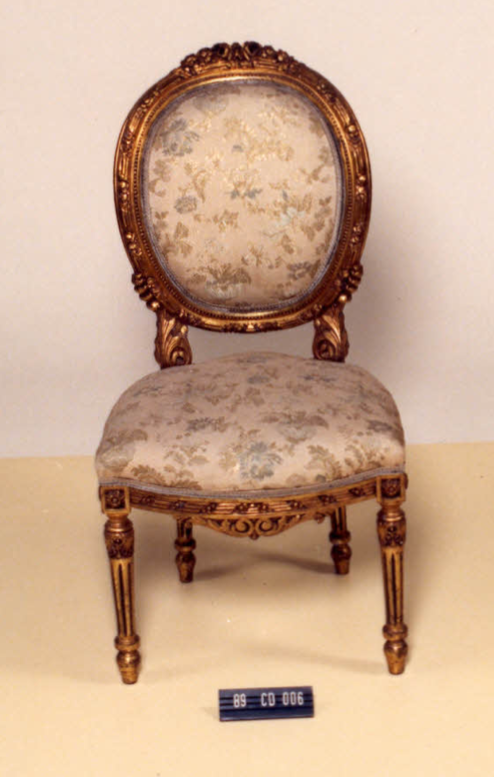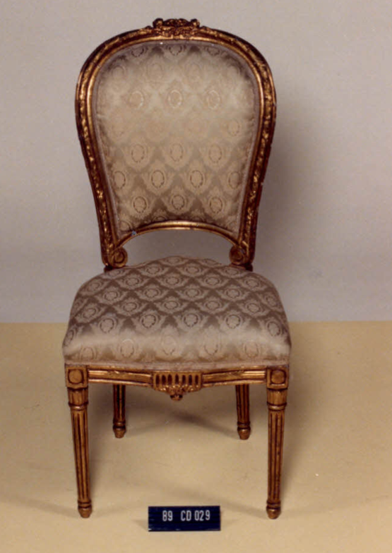 Cadeira com estrutura em madeira,estofamento em tecido brocado rege, espaldar tipo medalhão, contornado por fitas, flores e friso perolado. Arremate superior revestido de acantos. Assento em forma de escudo. Aba contornada por fitas e flores, ao meio arremate em acantos e volutas. Junto às pernas (dianteiras) quadrado com roseta. Pernas cilíndricas em caneluras, arremate superior […]