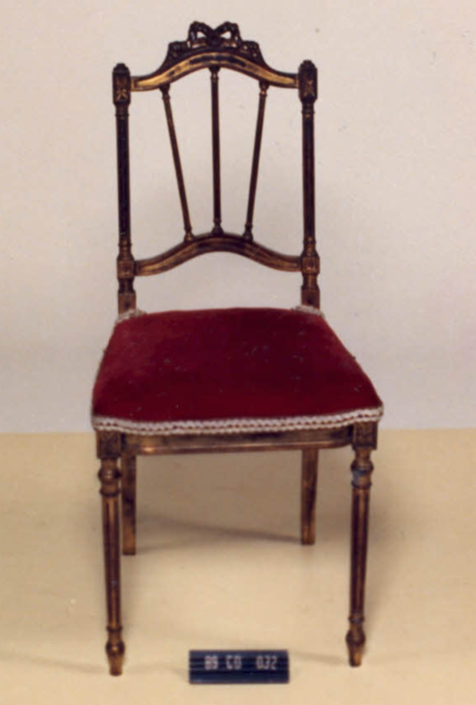 Cadeira com estrutura em madeira, assento estofado em veludo, dourada, espaldar em hastes cilíndricas, com caneluras, arremate em cubos e retângulos respectivarrente na parte inferior e superior, com flores. Cachaço arqueado, arrematado por laço. Tabela em três hastes cilíndricas. Parte inferior anqueada. Assento trapezoidal, com frente encurvada, arrematada por flores nas extremidades. Pernas dianteiras cilíndricas, […]