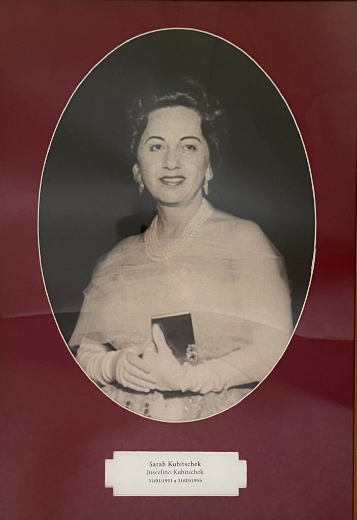 Retrato retangular com moldura dourada e paspatur em formato oval, forrado em veludo vermelho. O espaço reservado à imagem, no interior da moldura, mostra Sara Kubitschek, que utiliza um vestido branco de ombros à mostra, assim como brincos, colar de pérolas e luvas brancas, segurando uma pequena bolsa preta. A figura está sorrindo, possui cabelos […]