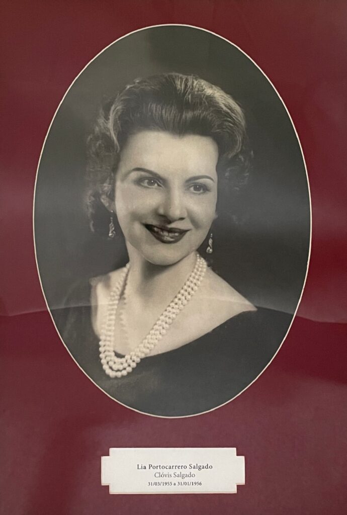 Retrato retangular com moldura dourada e paspatur em formato oval, forrado em veludo vermelho. O espaço reservado à imagem, no interior da moldura, mostra Lia Portocarrero Salgado, que utiliza um vestido preto, brincos e colar de pérolas. A figura está sorrindo, possui cabelos escuros e seu olhar está direcionado para a direita. A imagem está […]