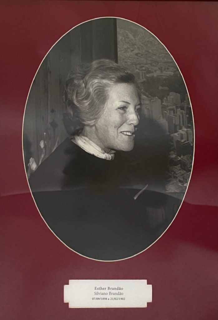 Retrato retangular, com moldura dourada e paspatur em formato oval, forrado em veludo vermelho. A fotografia mostra Esther de perfil, usando uma roupa preta que cobre todo o seu torso e possui uma gola branca. Seus cabelos são grisalhos e curtos. A figura sorri levemente em direção ao lado direito da fotografia. Ao fundo, pode-se […]