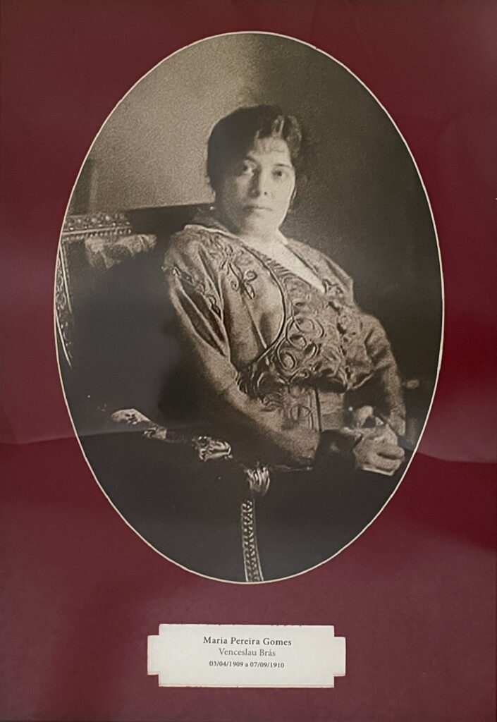 Retrato retangular, com moldura dourada e paspatur em formato oval, forrado em veludo vermelho. O espaço reservado à imagem, no interior da moldura, mostra Maria Pereira Gomes, que veste uma blusa cinza, com ornamentos floridos. Possui cabelos escuros que estão amarrados em um penteado na parte de trás de sua cabeça. A figura encara diretamente […]