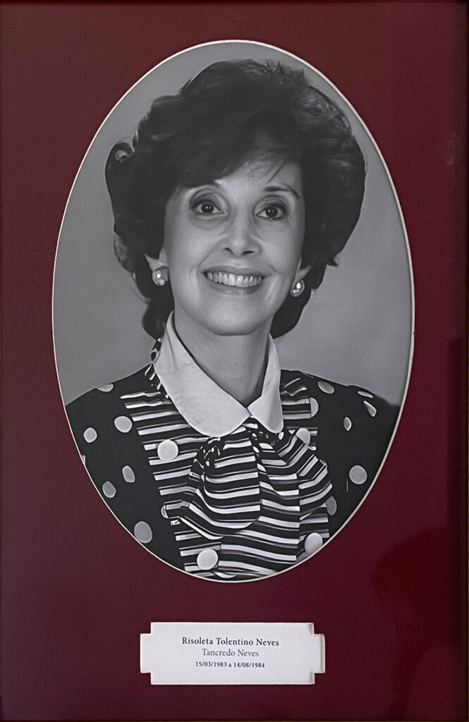 Retrato retangular, com moldura dourada e paspatur em formato oval, forrado em veludo vermelho. O espaço reservado à imagem, no interior da moldura, mostra Risoleta Neves,sorrindo, de cabelos curtos e volumosos, usa brincos de pérola e traja roupa preta com bolas brancas e listras na região central do busto, com gola branca e um laço […]