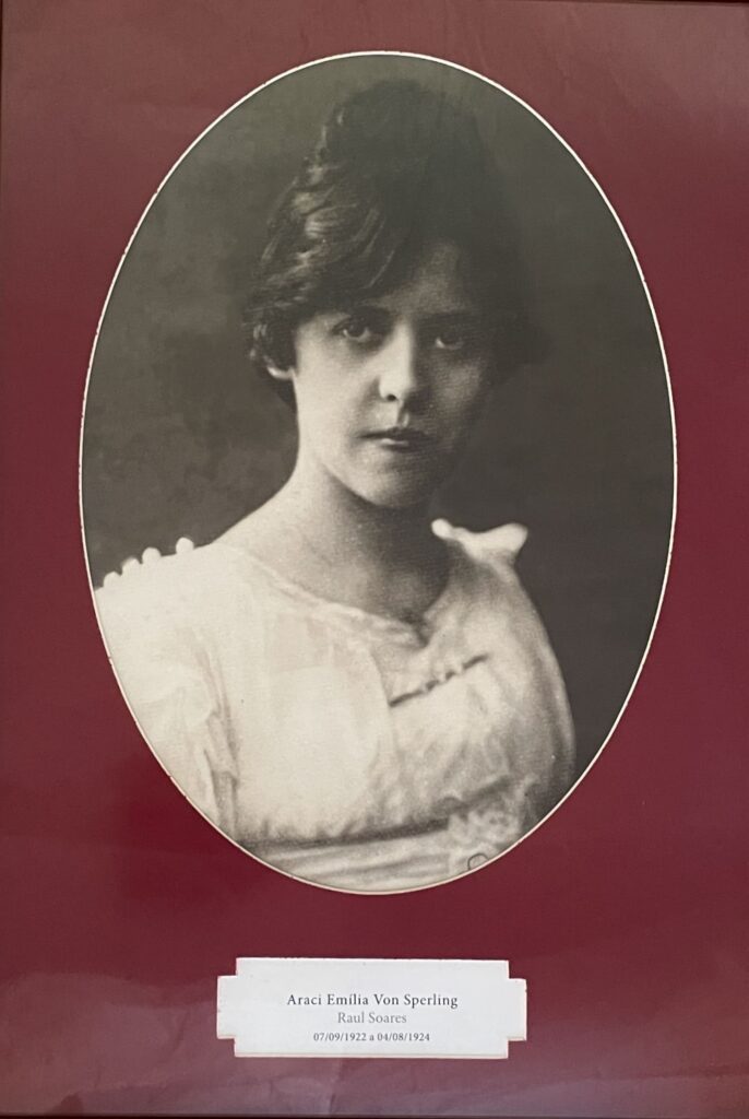Retrato retangular com moldura dourada e paspatur em formato oval, forrado em veludo vermelho. O espaço reservado à imagem, no interior da moldura, mostra Araci Emilia Von Sperling, que usa uma peça em tecido branco. Ela possui cabelos escuros que estão amarrados em um penteado acima de sua cabeça e seu olhar está direcionado à […]