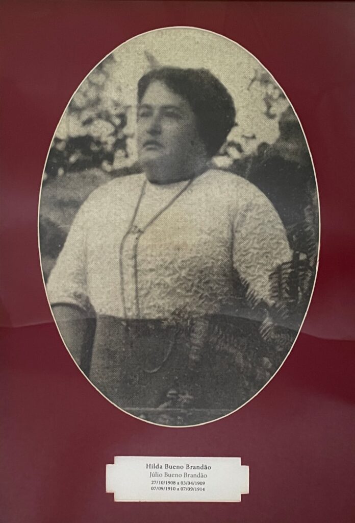Retrato retangular com moldura dourada e paspatur em formato oval, forrado em veludo vermelho. O espaço reservado à imagem, no interior da moldura, mostra Hilda Bueno Brandão, que veste uma blusa branca de mangas compridas e uma saia longa em tom escuro. Em seu peito, se encontra um fino colar, que se divide em dois […]