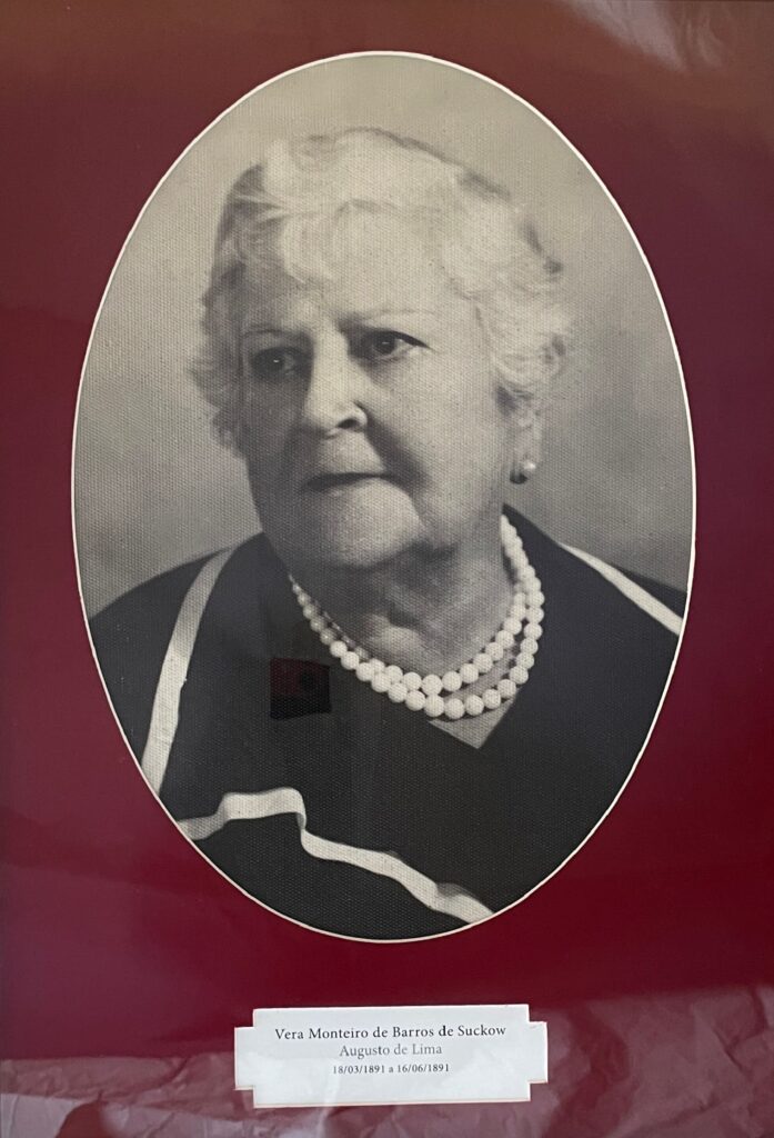 Retrato retangular com moldura dourada e paspatur em formato oval, forrado em veludo vermelho. O espaço reservado à imagem, no interior da moldura, mostra Vera Monteiro de Barros de Suckow trajando um blazer feminino preto com acentos brancos. Seus cabelos são completamente grisalhos e curtos. Em seu pescoço, se encontra um longo colar enrolado, ou, […]