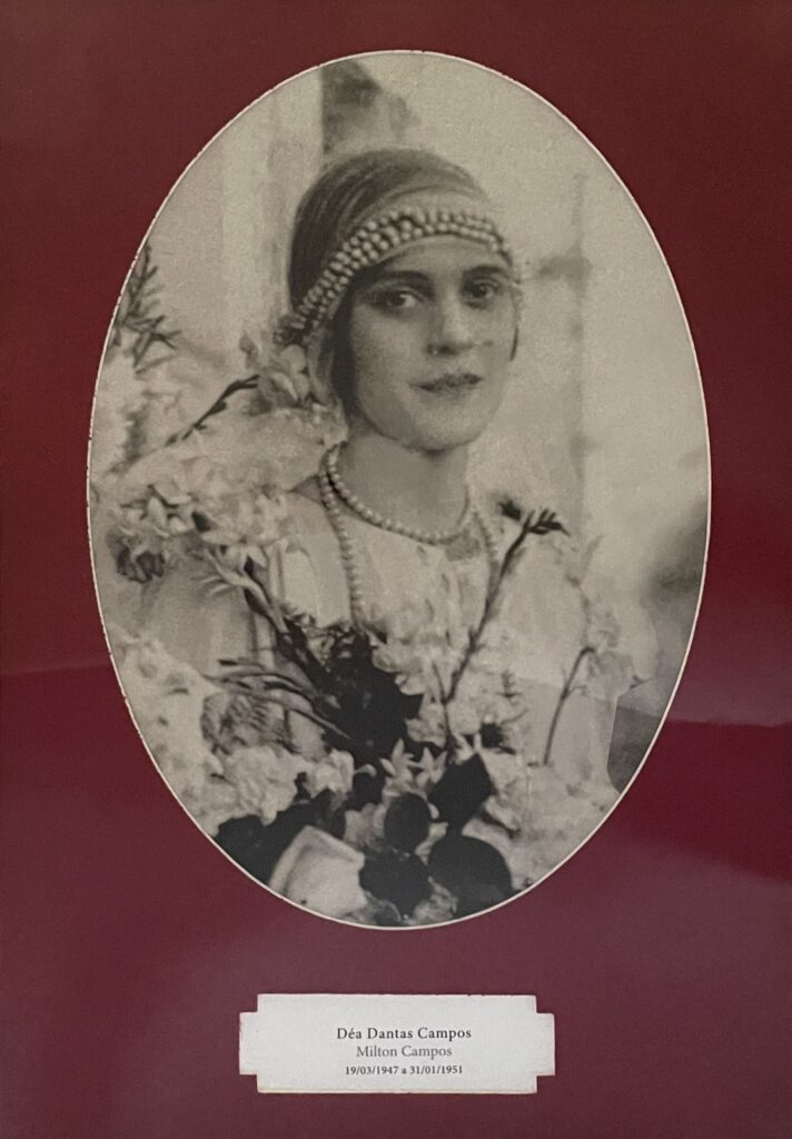 Retrato retangular com moldura dourada e paspatur em formato oval, forrado em veludo vermelho. O espaço reservado à imagem, no interior da moldura, mostra Déa Dantas Campos, vestindo traje branco e dois colares de pérolas. Seus cabelos escuros estão cobertos por um adorno semelhante a um chapéu, também decorado com pérolas. À esquerda da imagem […]