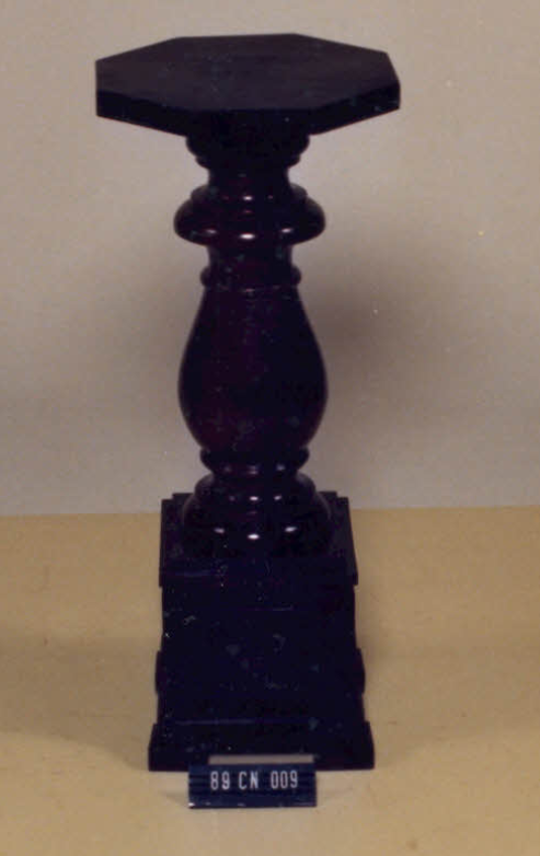 Cantoneira com tampo octogonal, coluna torneada em forma de balaustre, com nós e frisos. Base quadrangular, em molduras retangulares. Pés quadrangulares.
