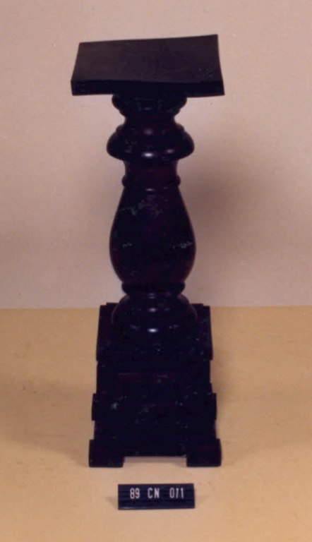 Cantoneira com tampo retangular, coluna torneada em forma de balaustre, com nós e frisos. Base quadrangular, em molduras retangulares. Pés quadrangulares.