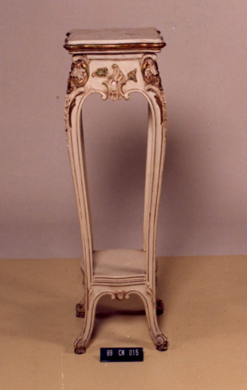 Cantoneira com tampo quadrangular, com recortes sinuosos, borda meia-cana. Aba recorta da em curva e contra-curva, ornada ao centro por rocalhas, C e flores. Quinas decoradas por cartela, concheados, C, e acanto. Pernas curvas com joelheiras suaves, ornadas por fitados; contorno em frisos e folhagens na parte inferior. Pés em volutas com sapatas. Prateleira inferior […]