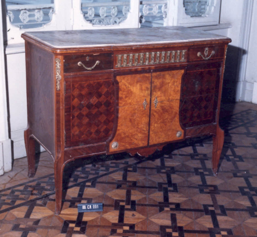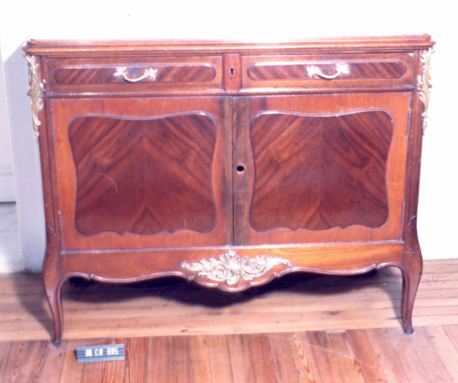 Móvel retangular, tampo em mármore, borda emoldurada. Parte superior com duas gavetas com puxadores à maneira de festão, espelho curvo em louro; ao centro elementos elípticos ornados por motivos fitomorfos de metal. Parte central com duas portas, parquetadas em xadrez; parte do meio ressaltada com espelhos curvos, em rocalhas; arremate inferior em rosetas. Quinas dianteiras […]