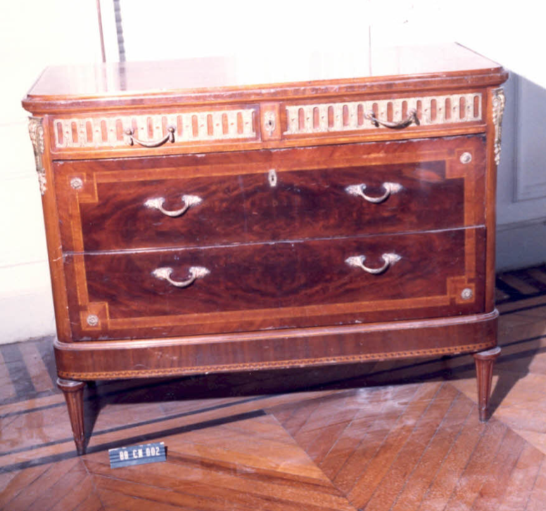 Móvel retangular de quinas (frente) arredondadas, tampo emoldurado. Parte superior com duas gavetas, ornadas por elerrentos elípticos, tulipas, com puxadores ao modo de festão, em metal. Fechadura central, espelho com motivos fitomorfos. Parte central, com dois gavetões, puxadores decorados por elemento fitormorfo contornados por friso parquetado, ângulos arrematados por roseta. Uma fechadura. Quinas arrematadas por […]