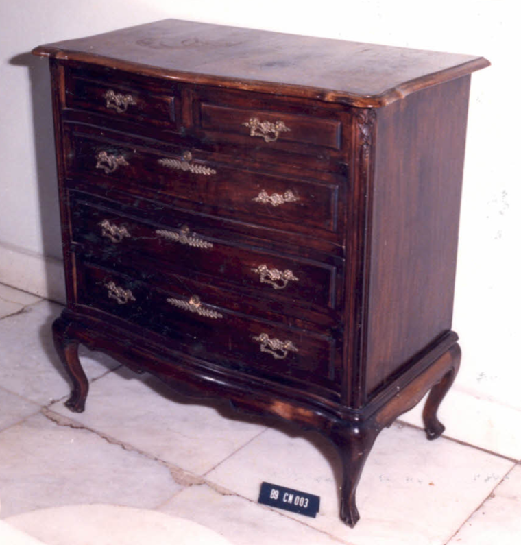 Móvel em forma de caixa retangular, com tampo de borda sinuosa, arredondada. Cinco gavetas ligeiramente abauladas, sendo duas gavetas menores superiores e três gavetões inferiores. Possuem almofadas, puxadores e espelhos recortados à maneira de elementos fitomorfos, guilhochês e concheados. Ornamento central em flor com dois ramos de folhagens, dispostos na horizontal. Quinas ornadas em concheados, […]