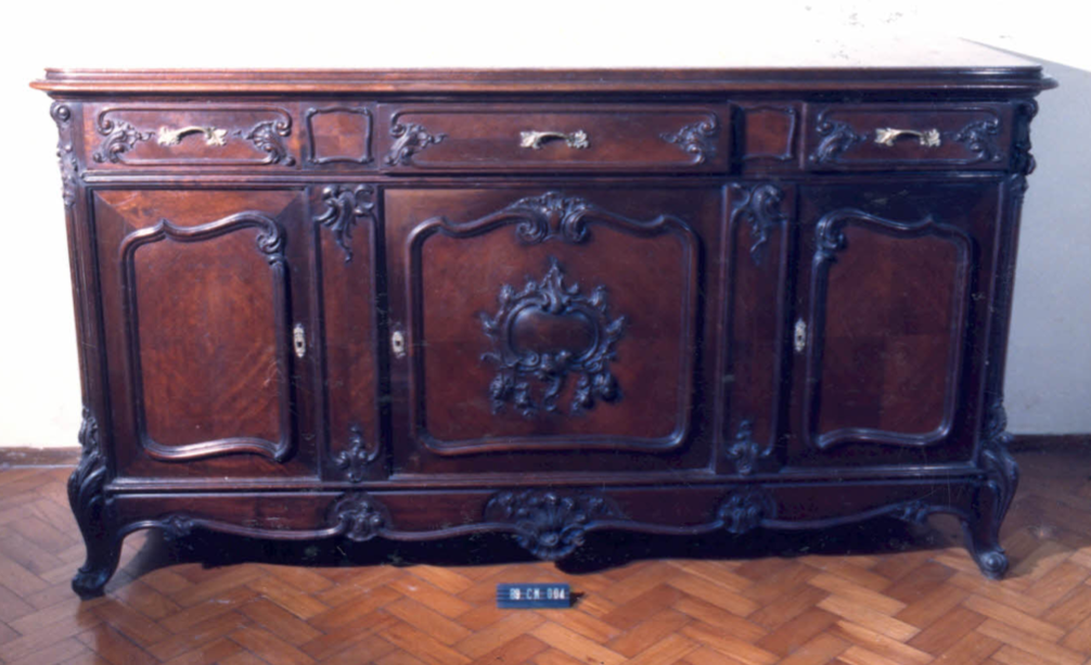 Móvel em forma de caixa retangular, tampo em márrrore rosa, borda com frisos meia-cana. Três gavetas superiores, ornadas por frIsos, cornucópias e concheados, puxadores em motivos fitorrorfos e concheados (metal); elemento de separação em frisos. Parte central com três portas, almofadas, contornadas por frisos sinuosos com folhagens. Porta central ornada com cartela oval, contornada por […]